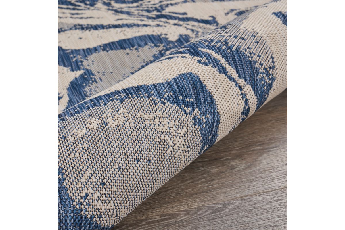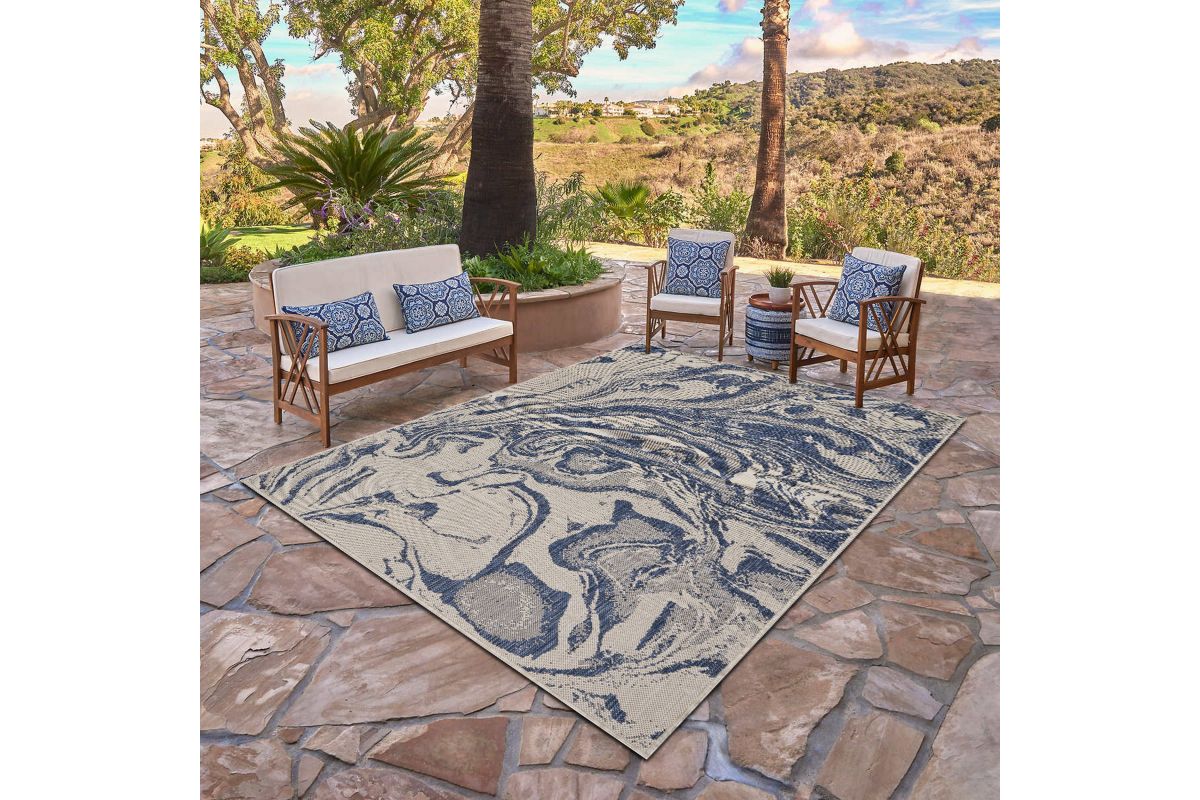 Transform your space with this durable indoor/outdoor area rug. The nautical-inspired abstract wave pattern in navy blue and beige adds coastal charm, making it a stunning foundation for beach house, tropical, or nautical interiors or exteriors. Expertly power-loomed in Turkey, this rug is crafted from a premium polypropylene blend, offering a soft yet durable texture that stands up to everyday wear and outdoor elements. Perfect for adding a refined touch to living rooms, bedrooms, or entryways, this 3' x 5' rug blends coastal charm with lasting quality. Designed for high-traffic areas, this stain, moisture, and fade-resistant, easy-to-clean rug maintains long-lasting beauty, ensuring your home stays stylish with minimal maintenance. Perfect for anyone seeking a durable, elegant, and versatile rug for your home, apartment, or dorm.