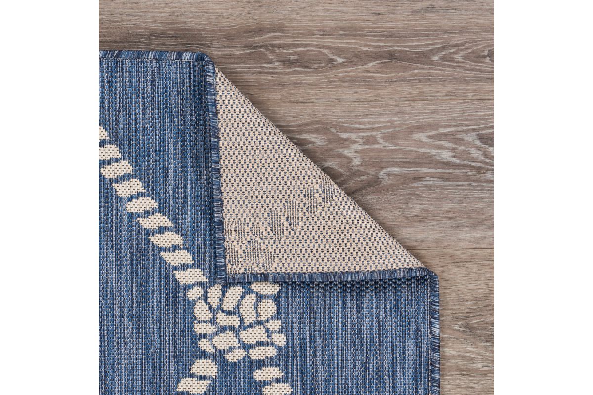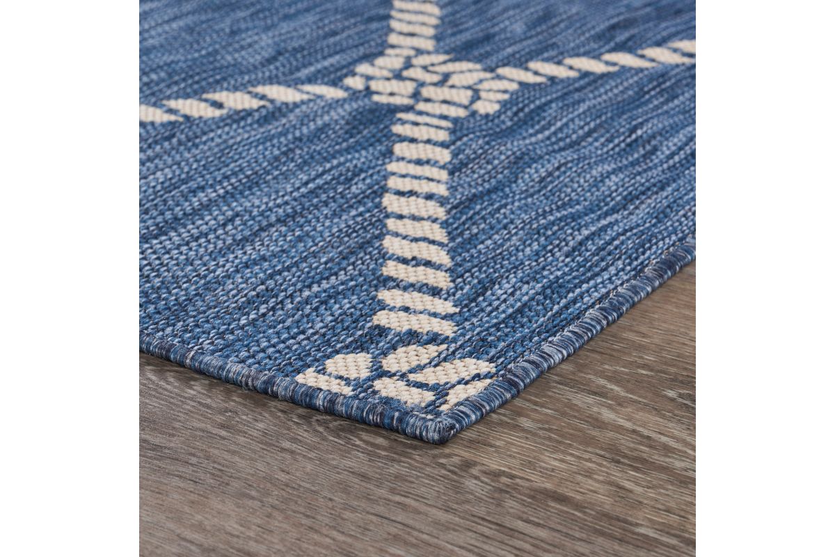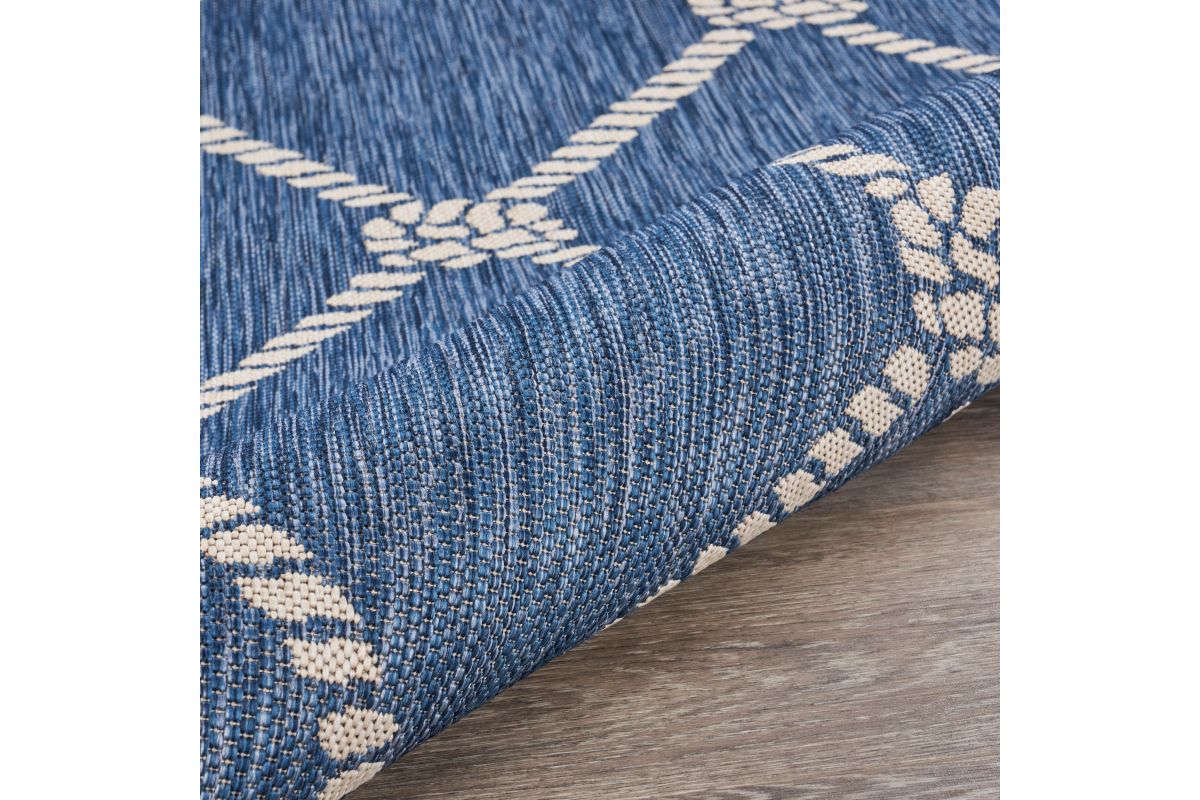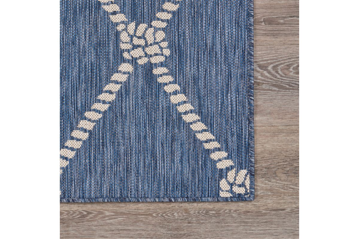 Transform your space with this durable indoor/outdoor area rug. The nautical-inspired rope lattice pattern in navy blue and white adds coastal charm, making it a stunning foundation for beach house, tropical, or nautical interiors or exteriors. Expertly power-loomed in Turkey, this rug is crafted from a premium polypropylene blend, offering a soft yet durable texture that stands up to everyday wear and outdoor elements. Perfect for adding a refined touch to living rooms, bedrooms, or home offices, this 5'3" x 7' rug blends coastal charm with lasting quality. Designed for high-traffic areas, this stain, moisture, and fade-resistant, easy-to-clean rug maintains long-lasting beauty, ensuring your home stays stylish with minimal maintenance. Perfect for anyone seeking a durable, elegant, and versatile rug for your home, apartment, or dorm.