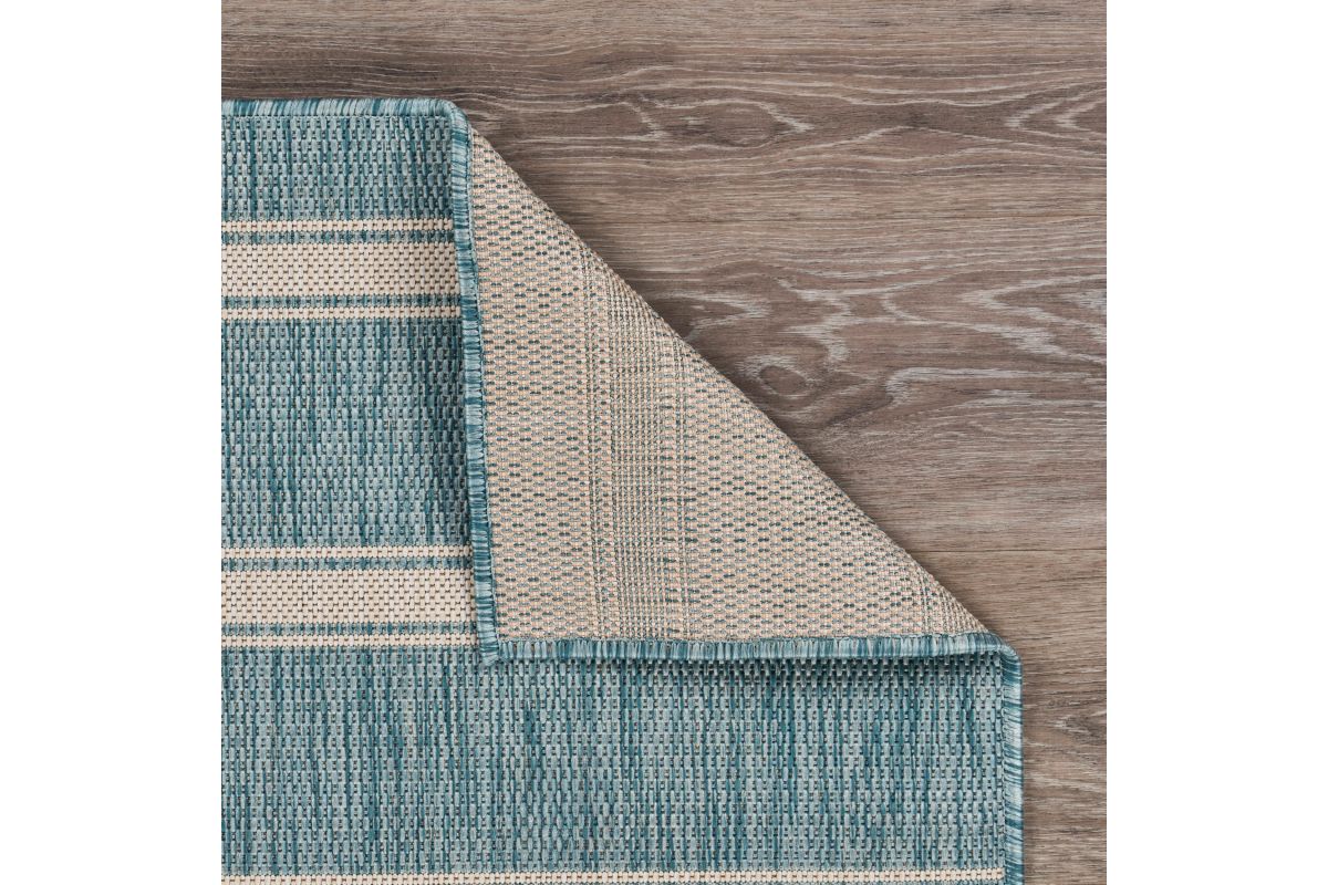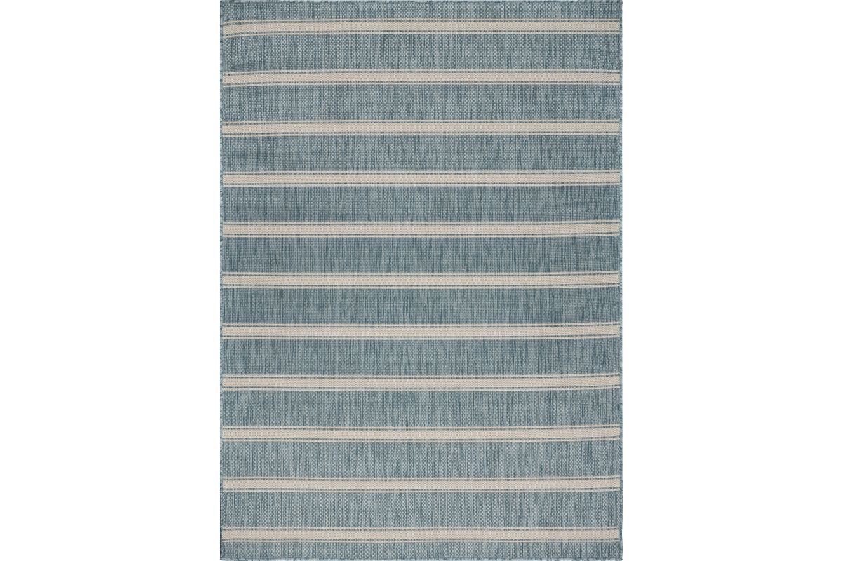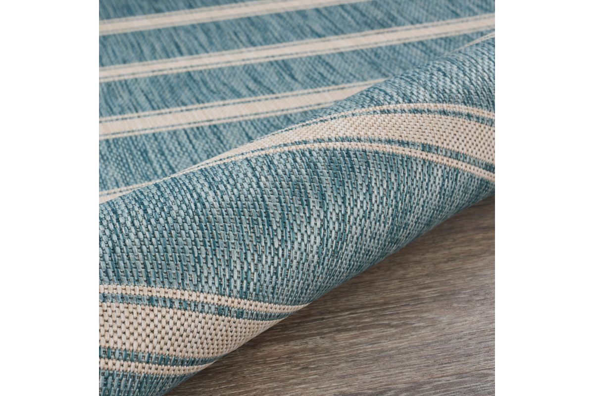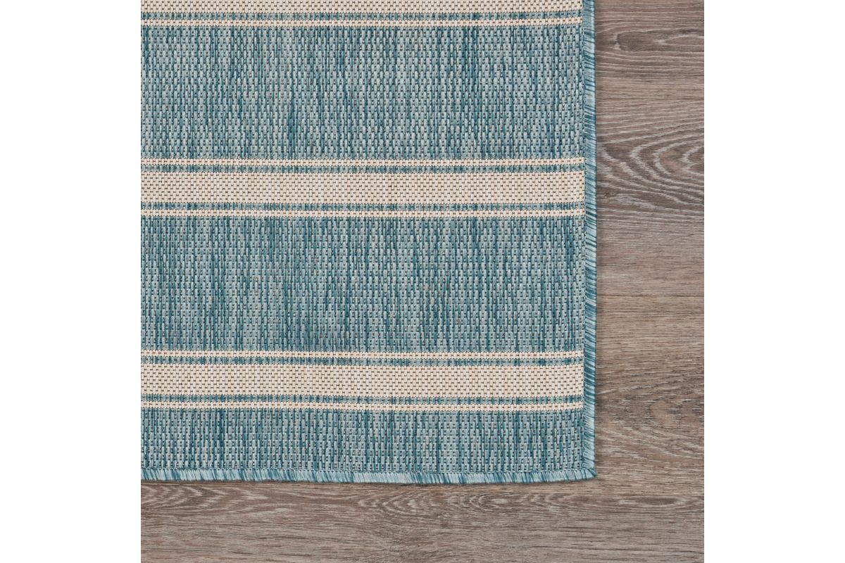 Transform your space with this durable indoor/outdoor area rug. The nautical-inspired geometric stripe pattern in aqua blue and beige adds coastal charm, making it a stunning foundation for beach house, tropical, or nautical interiors or exteriors. Expertly power-loomed in Turkey, this rug is crafted from a premium polypropylene blend, offering a soft yet durable texture that stands up to everyday wear and outdoor elements. Perfect for adding a refined touch to living rooms, bedrooms, or home offices, this 5'3" x 7' rug blends coastal charm with lasting quality. Designed for high-traffic areas, this stain, moisture, and fade-resistant, easy-to-clean rug maintains long-lasting beauty, ensuring your home stays stylish with minimal maintenance. Perfect for anyone seeking a durable, elegant, and versatile rug for your home, apartment, or dorm.