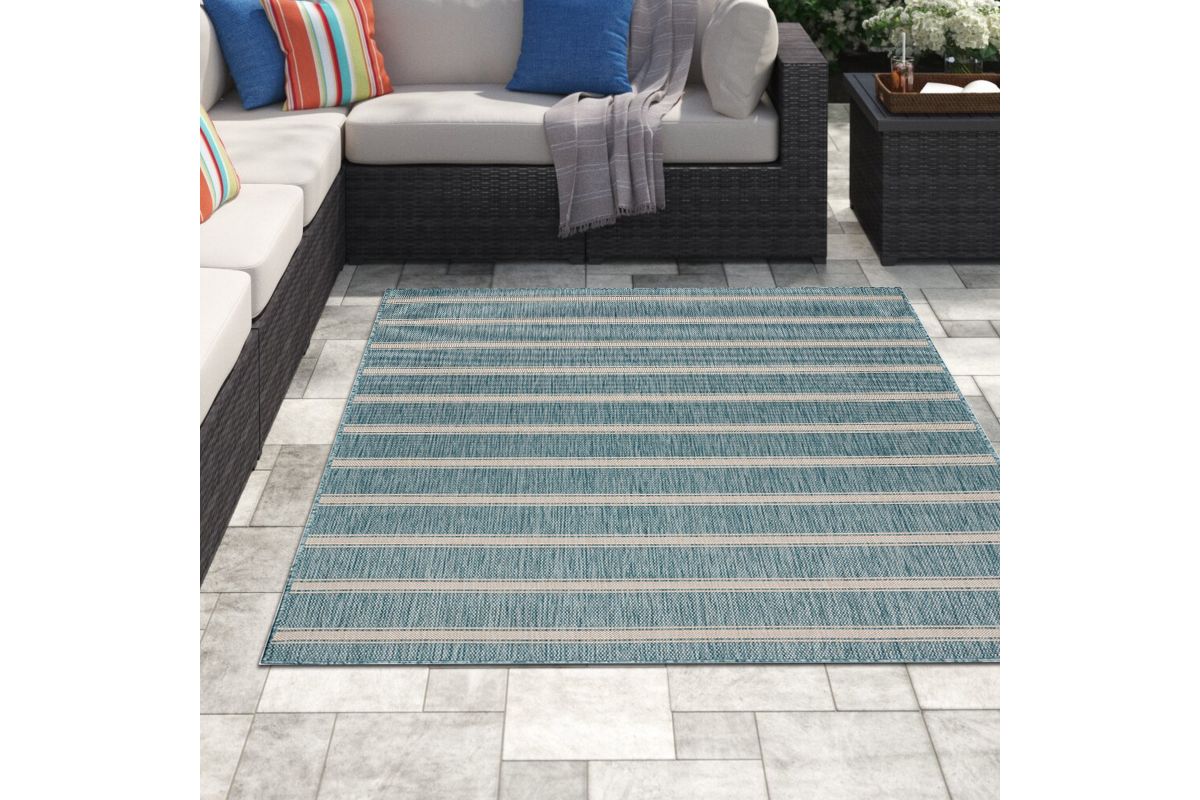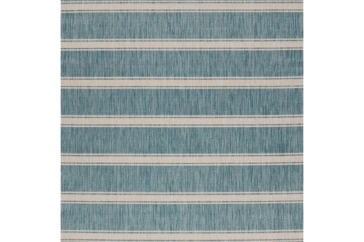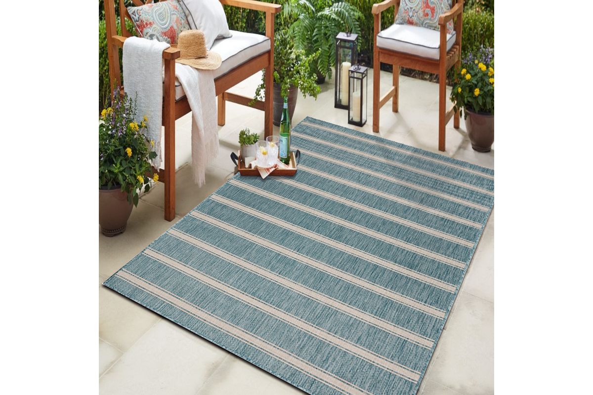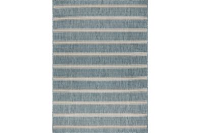 Transform your space with this durable indoor/outdoor area rug. The nautical-inspired geometric stripe pattern in aqua blue and beige adds coastal charm, making it a stunning foundation for beach house, tropical, or nautical interiors or exteriors. Expertly power-loomed in Turkey, this rug is crafted from a premium polypropylene blend, offering a soft yet durable texture that stands up to everyday wear and outdoor elements. Perfect for adding a refined touch to living rooms, bedrooms, or home offices, this 5'3" x 7' rug blends coastal charm with lasting quality. Designed for high-traffic areas, this stain, moisture, and fade-resistant, easy-to-clean rug maintains long-lasting beauty, ensuring your home stays stylish with minimal maintenance. Perfect for anyone seeking a durable, elegant, and versatile rug for your home, apartment, or dorm.