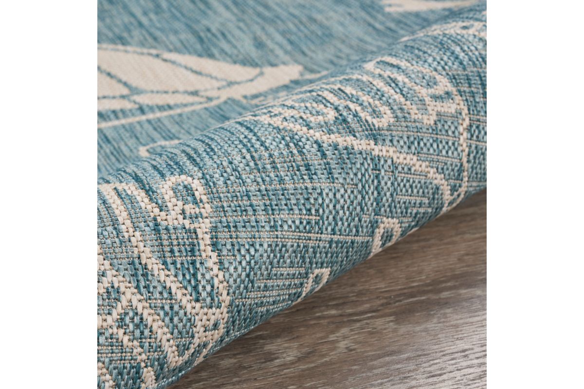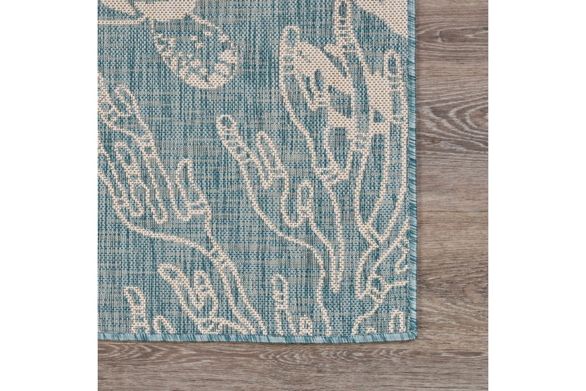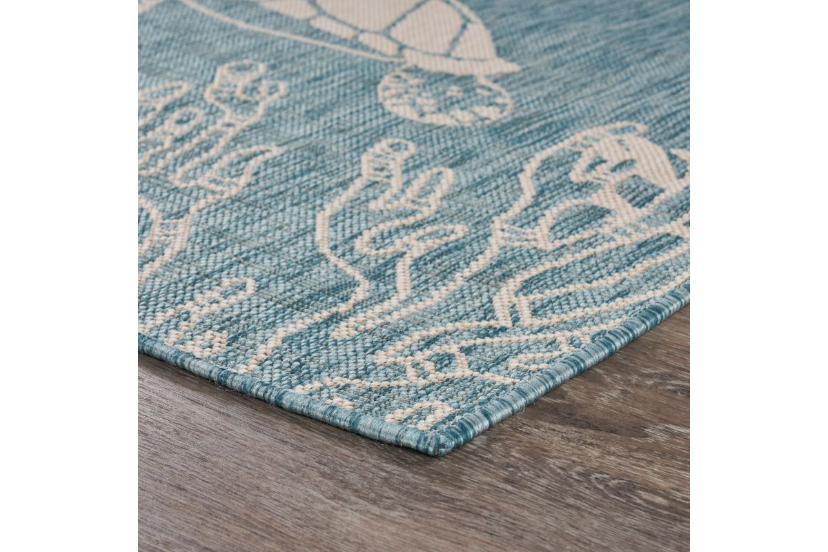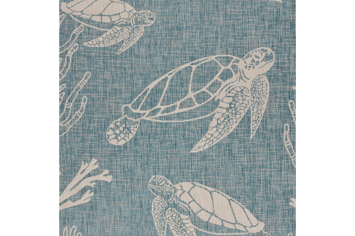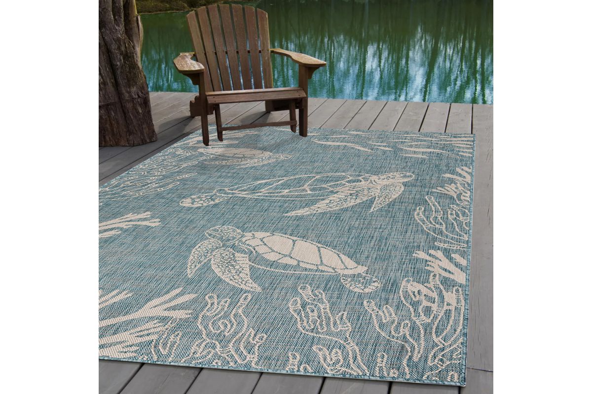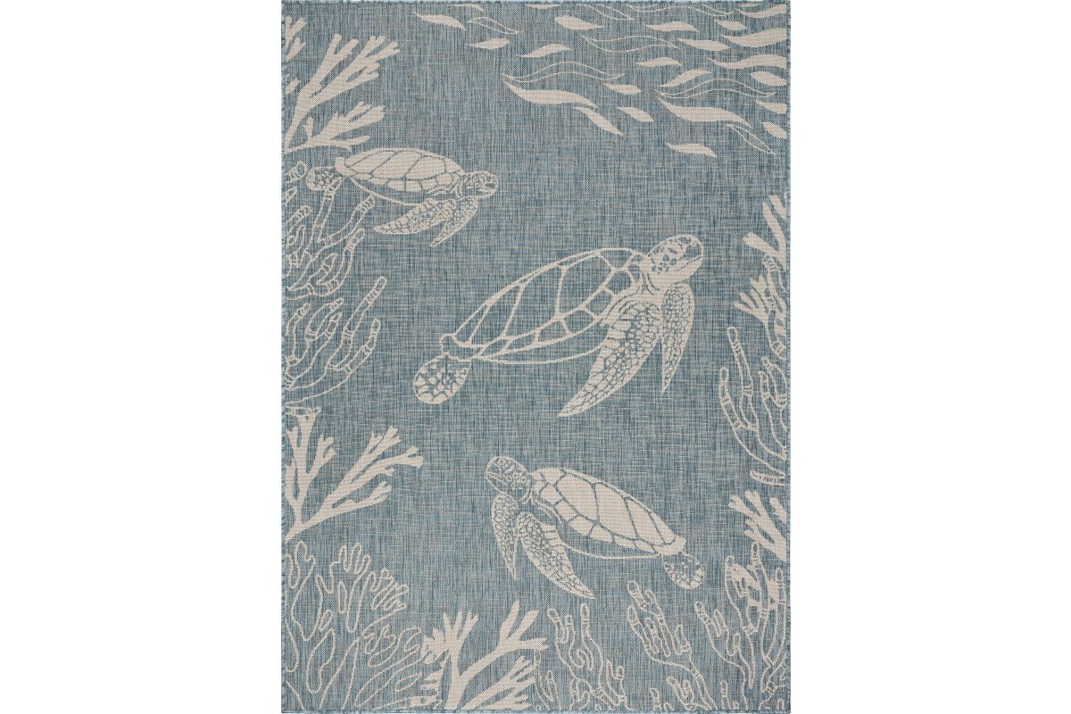 Transform your space with this durable indoor/outdoor area rug. The nautical-inspired sea turtle and coral scene in aqua blue and beige adds coastal charm, making it a stunning foundation for beach house, tropical, or nautical interiors or exteriors. Expertly power-loomed in Turkey, this rug is crafted from a premium polypropylene blend, offering a soft yet durable texture that stands up to everyday wear and outdoor elements. Perfect for adding a refined touch to living rooms, bedrooms, or entryways, this 3' x 5' rug blends coastal charm with lasting quality. Designed for high-traffic areas, this stain, moisture, and fade-resistant, easy-to-clean rug maintains long-lasting beauty, ensuring your home stays stylish with minimal maintenance. Perfect for anyone seeking a durable, elegant, and versatile rug for your home, apartment, or dorm.