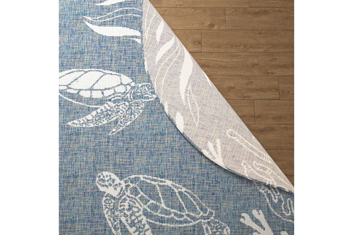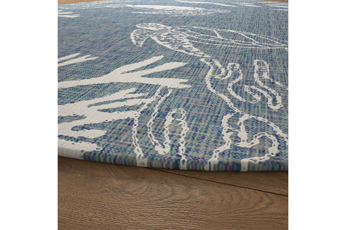 Transform your space with this durable indoor/outdoor area rug. The nautical-inspired sea turtle and coral scene in aqua blue and beige adds coastal charm, making it a stunning foundation for beach house, tropical, or nautical interiors or exteriors. Expertly power-loomed in Turkey, this rug is crafted from a premium polypropylene blend, offering a soft yet durable texture that stands up to everyday wear and outdoor elements. Perfect for adding a refined touch to living rooms, dining areas, or beneath a round dining table, this 7'6" round rug blends coastal charm with lasting quality. Designed for high-traffic areas, this stain, moisture, and fade-resistant, easy-to-clean rug maintains long-lasting beauty, ensuring your home stays stylish with minimal maintenance. Perfect for anyone seeking a durable, elegant, and versatile rug for your home, apartment, or dorm.