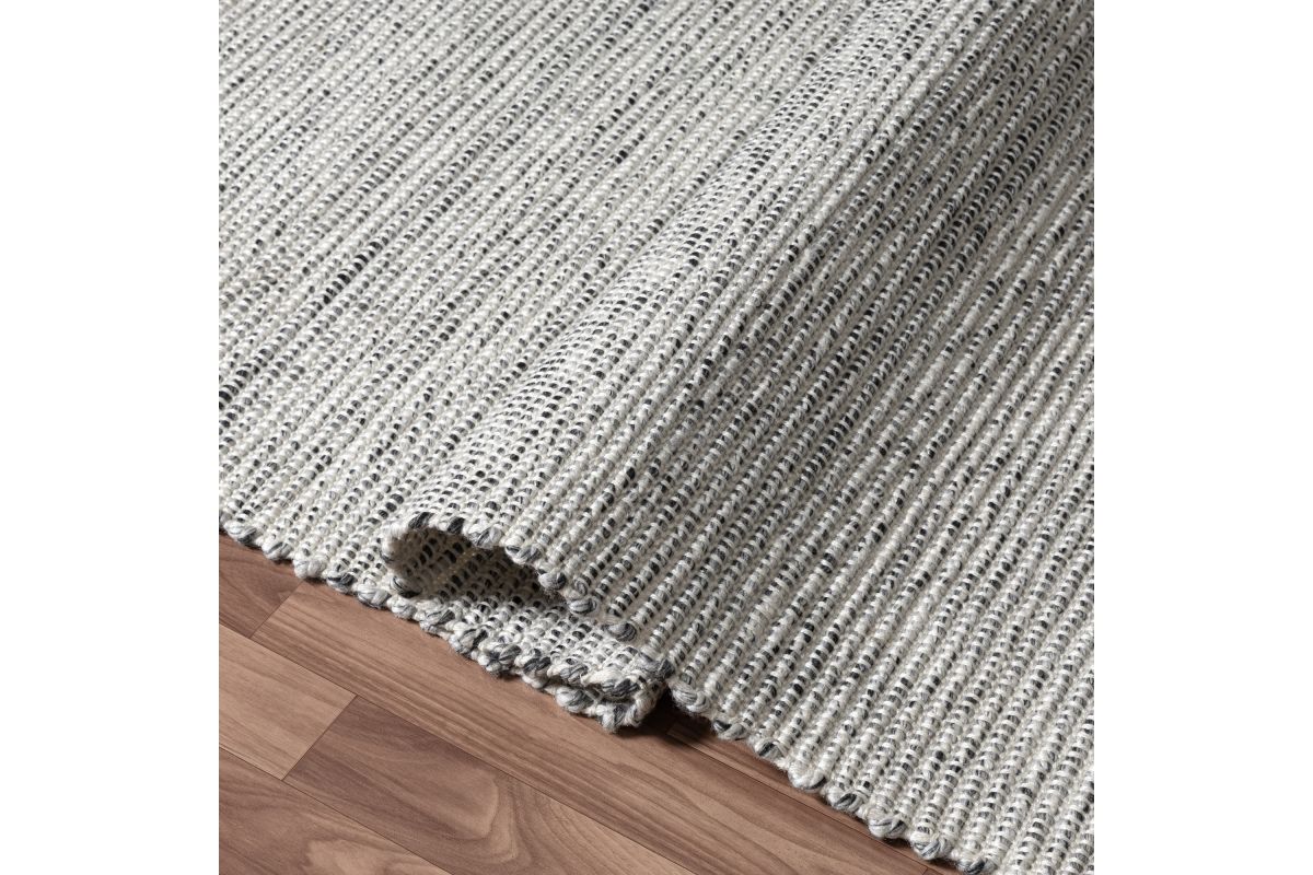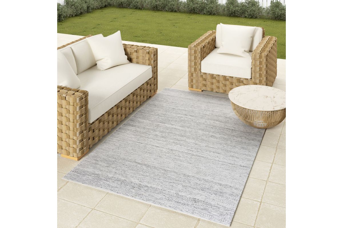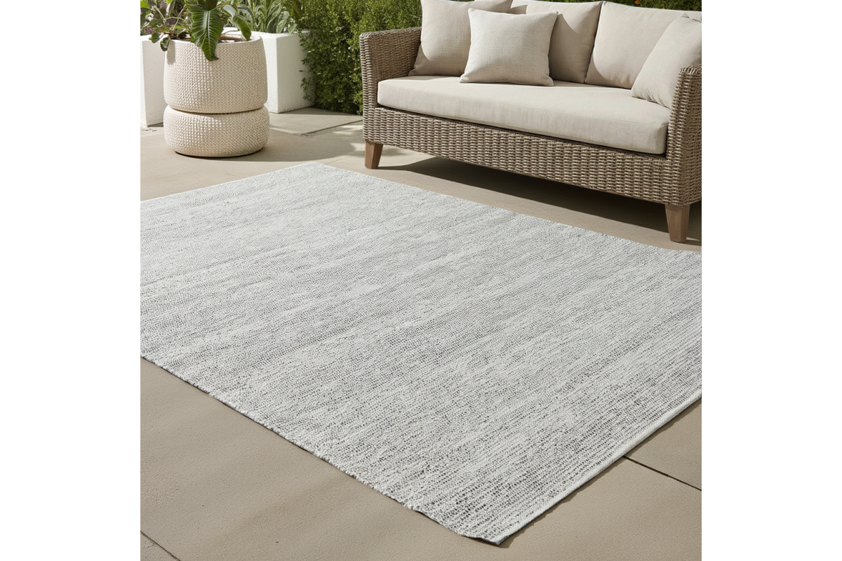 Elevate your outdoor space with this rustic hand-woven area rug in silver and ivory. Featuring a distressed striped pattern in cool gray and ivory tones, this weather-resistant rug adds a cozy, modern touch to patios, decks, porches, or indoor living spaces. Hand-woven in India from 100% polyester, it offers a soft yet durable surface that withstands foot traffic and the elements. A clear non-skid latex backing helps prevent slipping, while its spot-cleanable design ensures easy maintenance. Perfect for transitional and contemporary décor.