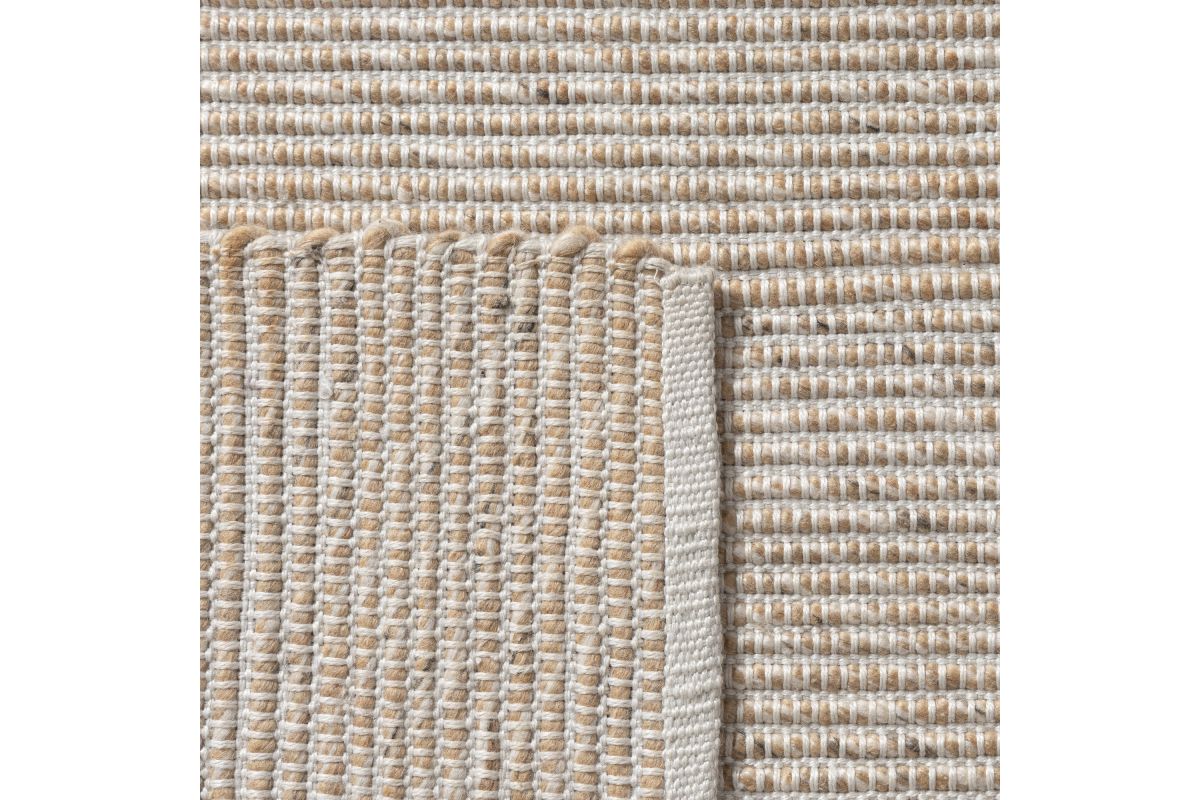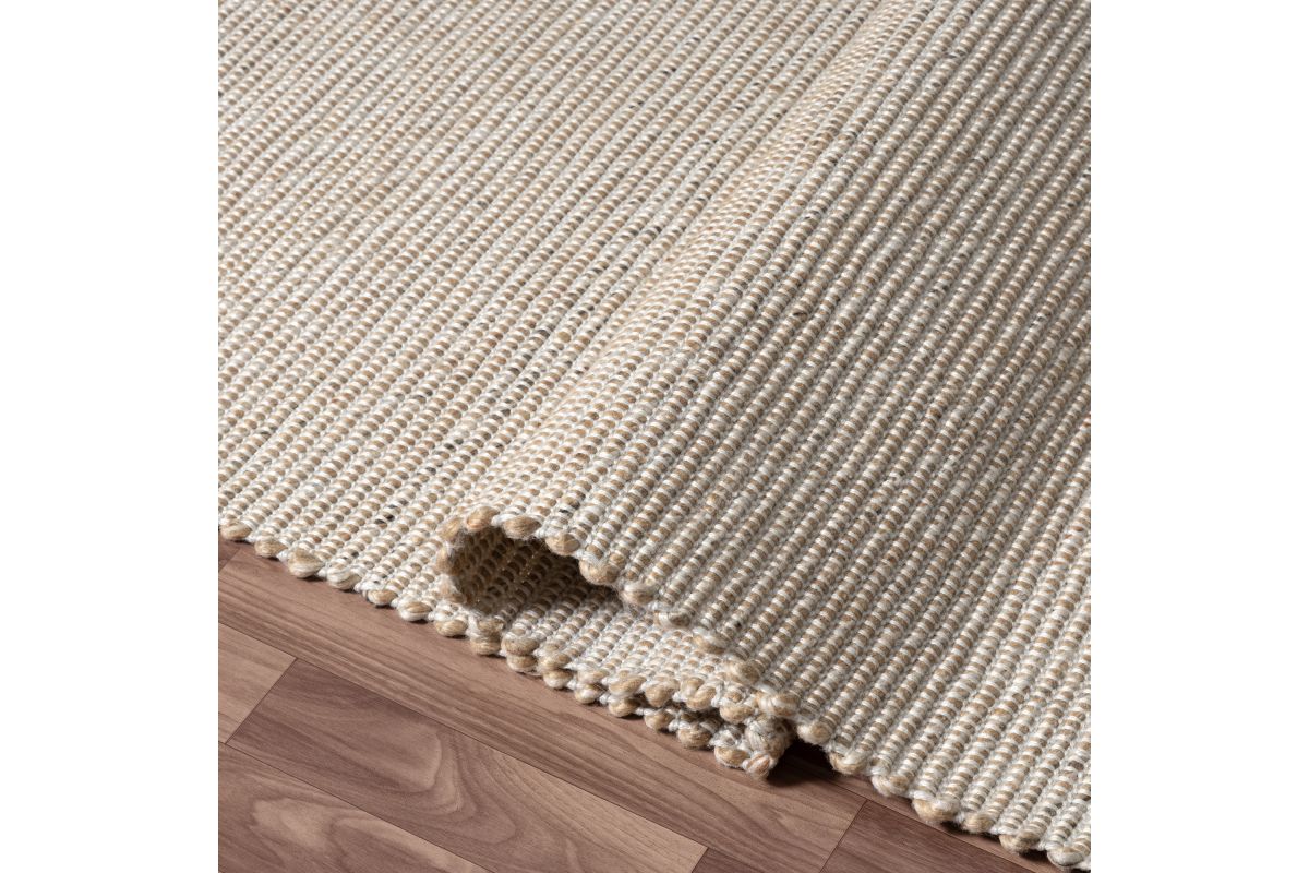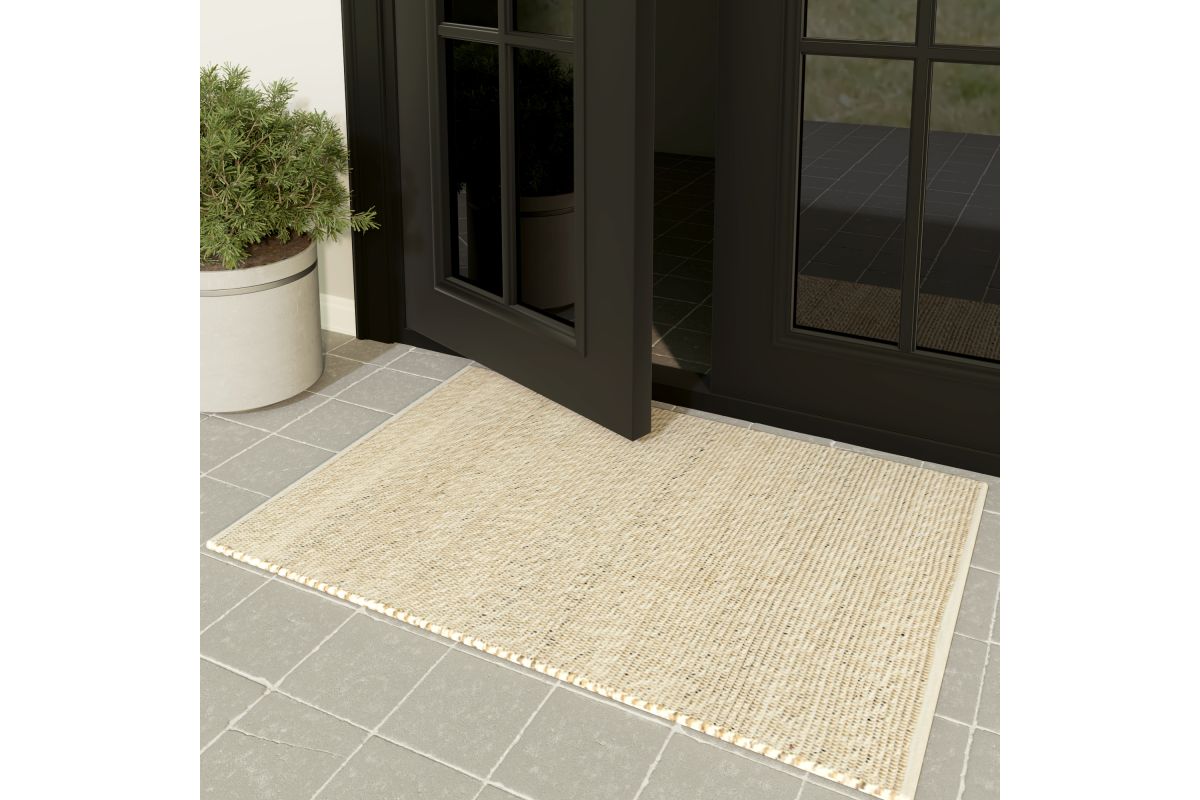 Elevate your outdoor space with this rustic hand-woven area rug in sand and ivory. Featuring a distressed striped pattern in warm beige and ivory tones, this weather-resistant rug adds a cozy, modern touch to patios, decks, porches, or indoor living spaces. Hand-woven in India from 100% polyester, it offers a soft yet durable surface that withstands foot traffic and the elements. A clear non-skid latex backing helps prevent slipping, while its spot-cleanable design ensures easy maintenance. Perfect for transitional and contemporary décor.