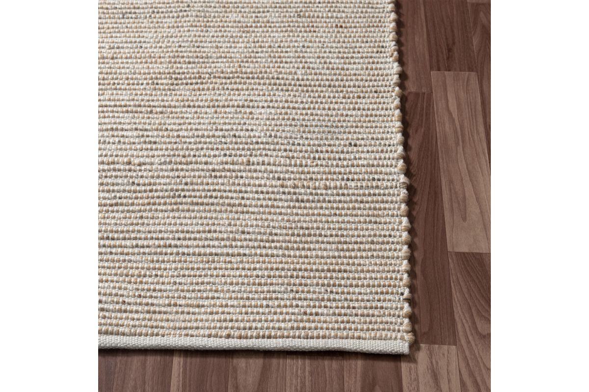 Elevate your outdoor space with this rustic hand-woven area rug in sand and ivory. Featuring a distressed striped pattern in warm beige and ivory tones, this weather-resistant rug adds a cozy, modern touch to patios, decks, porches, or indoor living spaces. Hand-woven in India from 100% polyester, it offers a soft yet durable surface that withstands foot traffic and the elements. A clear non-skid latex backing helps prevent slipping, while its spot-cleanable design ensures easy maintenance. Perfect for transitional and contemporary décor.