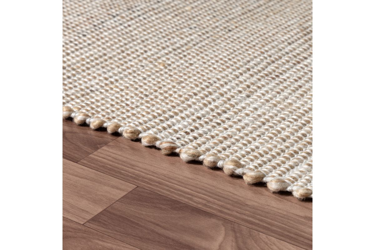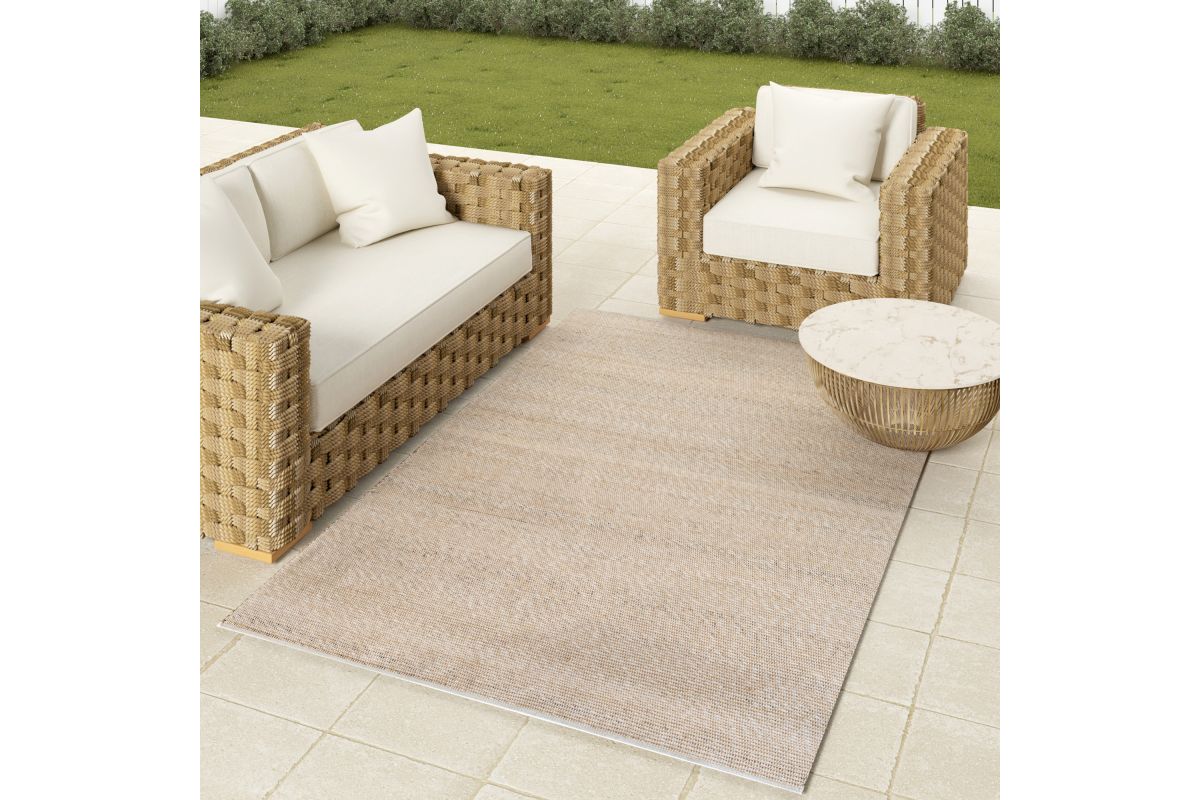 Elevate your outdoor space with this rustic hand-woven area rug in sand and ivory. Featuring a distressed striped pattern in warm beige and ivory tones, this weather-resistant rug adds a cozy, modern touch to patios, decks, porches, or indoor living spaces. Hand-woven in India from 100% polyester, it offers a soft yet durable surface that withstands foot traffic and the elements. A clear non-skid latex backing helps prevent slipping, while its spot-cleanable design ensures easy maintenance. Perfect for transitional and contemporary décor.