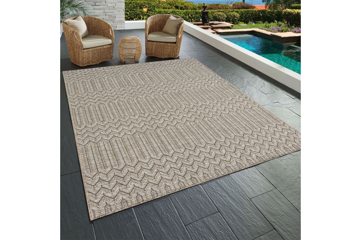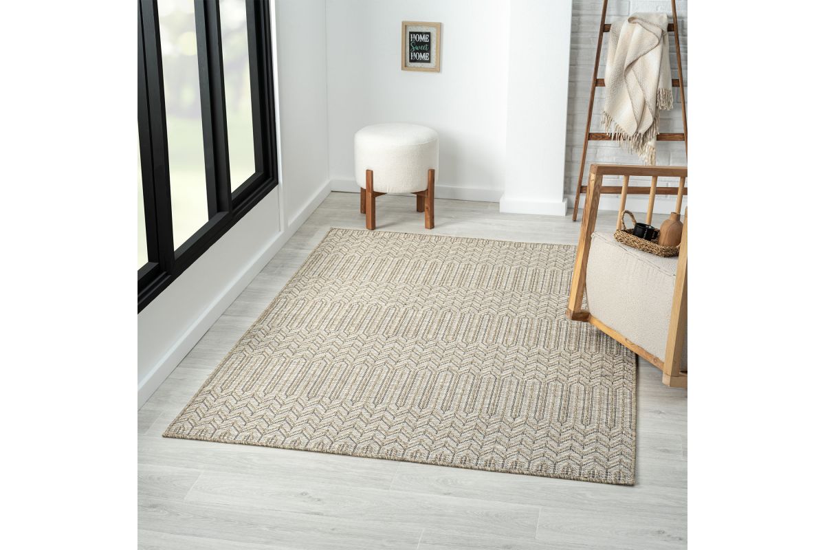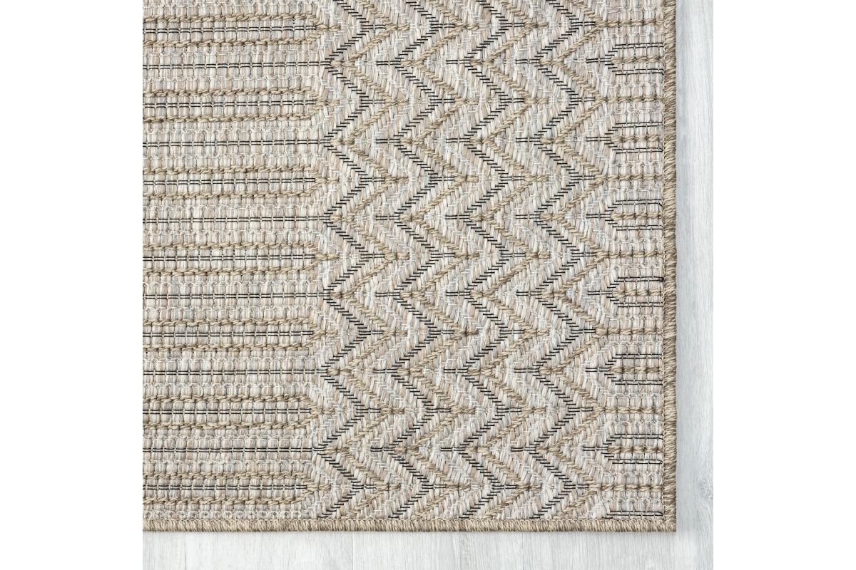 Accent your home with this modern chevron indoor and outdoor safe area rug. Inspired from the natural tones and designs of jute pieces, this rug features a variety of patterns and textures to bring a stunning natural look to your outdoor space. Powerloomed in Egypt from stain and fade resistant polypropylene threads, this rug is the perfect piece for everyday use. Perfectly suited for living rooms, dining rooms, kitchens, bedrooms, and patios, add aesthetic functionality with this neutral long-lasting, and durable indoor and outdoor safe rug.