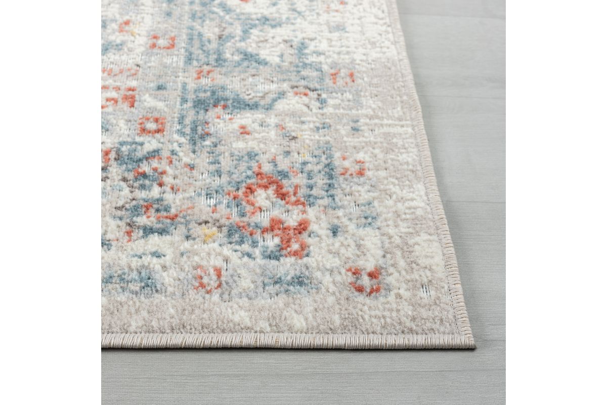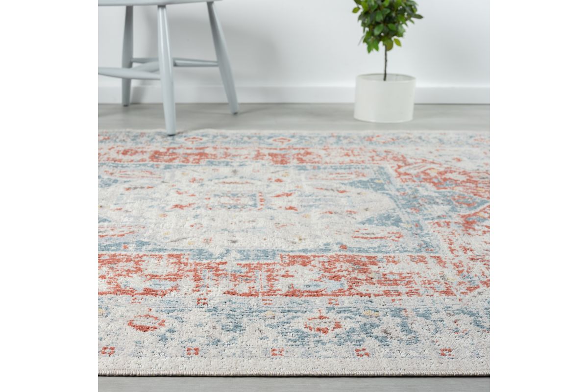 Transform your space with a perfect balance of durability and style with this versatile indoor/outdoor area rug. A bordered faded medallion with delicate distressing graces this piece from edge to edge in shades of red, gray, and blue, creating an eye-catching foundation for patios, decks, sunrooms, living rooms, bedrooms, and any area indoors or out. Each rug is power loomed using traditional techniques out of polypropylene fibers, which allow you to enjoy high-end design without sacrificing comfort or durability. Perfect for a wide range of decor styles and ages from adult to kids, this beautiful rug will do well in any area of your home. The performance materials and construction make this rug fade, stain, and moisture resistant - perfect for busy homes with children and pet friendly.