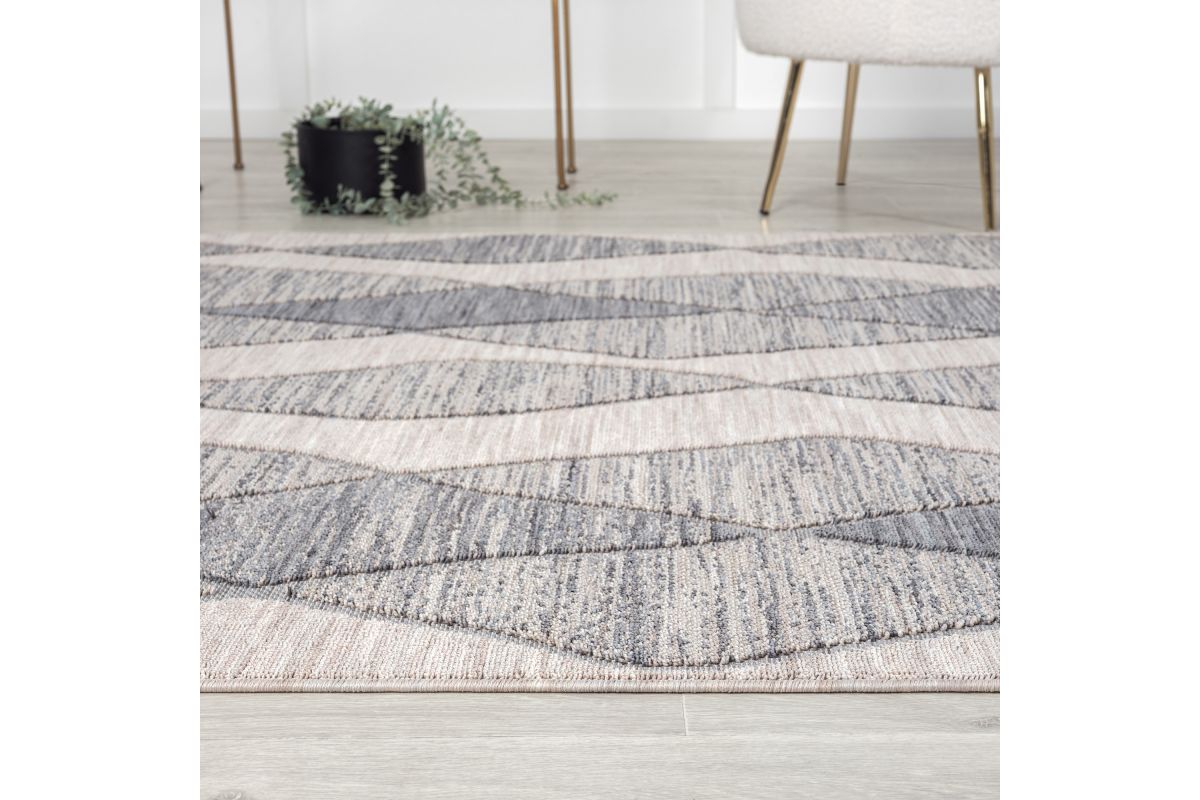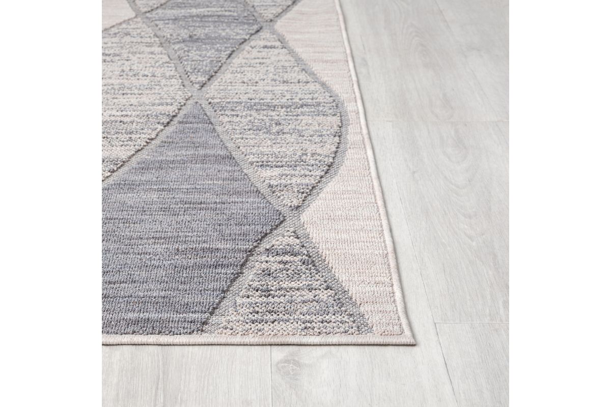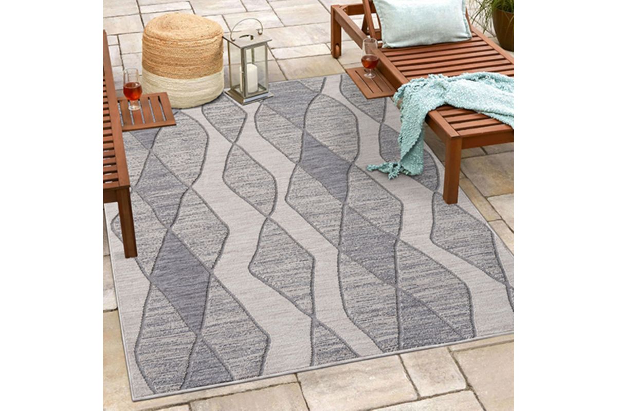 Accent your living room, dining room, porch, deck, or patio, with this indoor/outdoor area rug. Meticulously crafted from dozens of recycled plastic bottles, this rug is surprisingly soft while proudly being environmentally friendly. Featuring a contemporary high-low abstract geometric pattern in blue and grey neutral colors, it will add dimension to any of your rooms while effortlessly blending in with the rest of your decor. Bring this piece of floor art home and see it add life to your space in an instant.