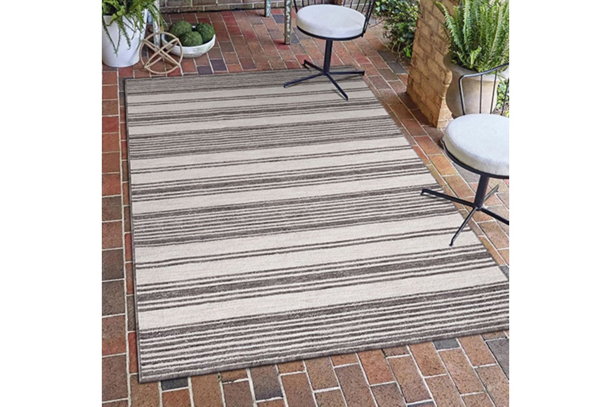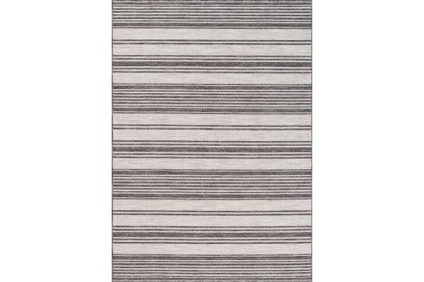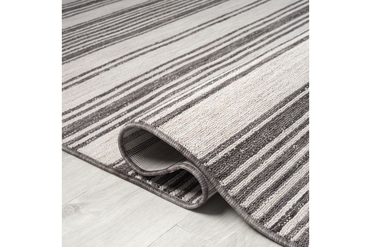 Accent your living room, dining room, porch, deck, or patio, with this indoor/outdoor area rug. Meticulously crafted from dozens of recycled plastic bottles, this rug is surprisingly soft while proudly being environmentally friendly. Featuring a contemporary high-low striped pattern in ivory & anthracite black neutral colors, it will add dimension to any of your rooms while effortlessly blending in with the rest of your decor. Bring this piece of floor art home and see it add life to your space in an instant.