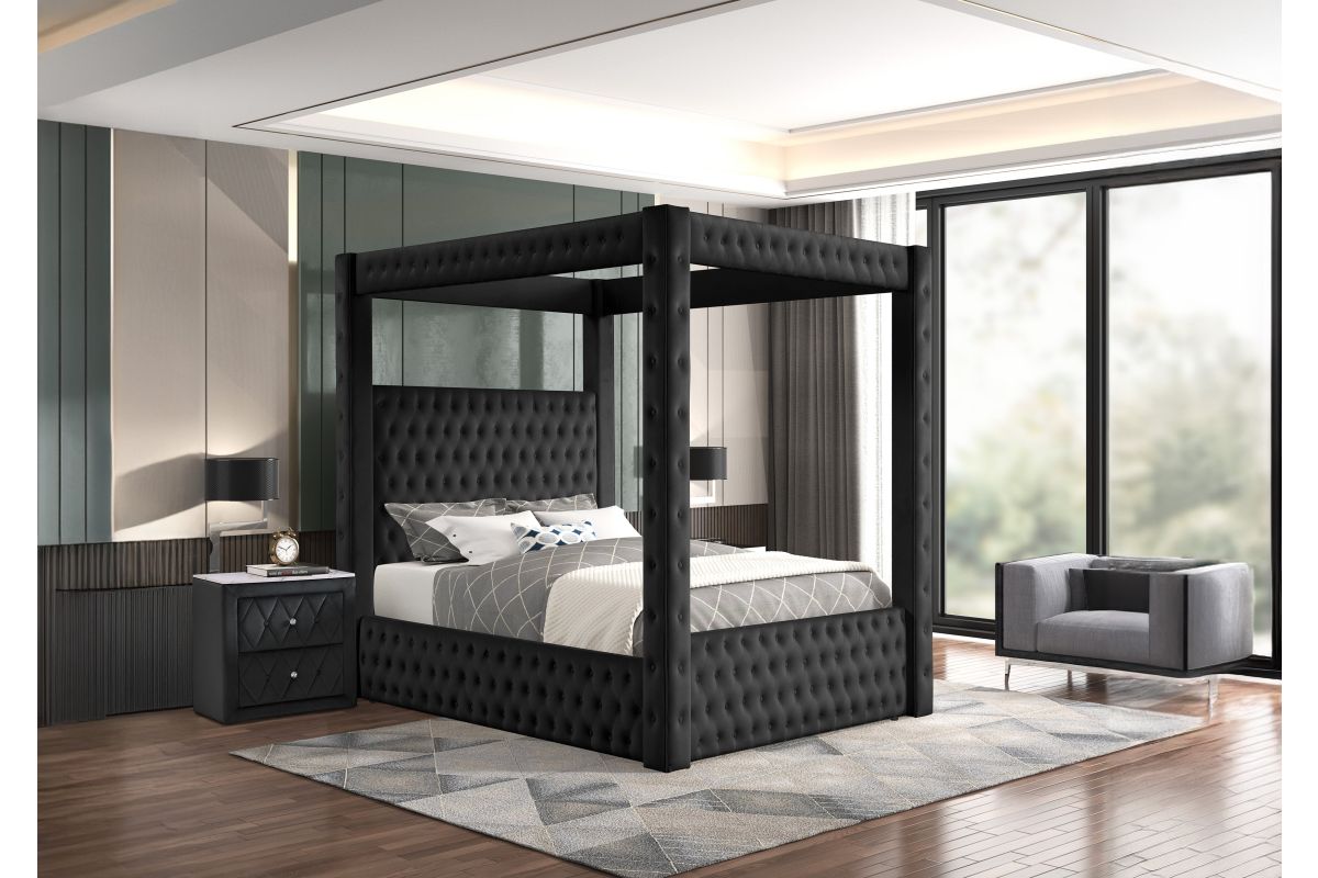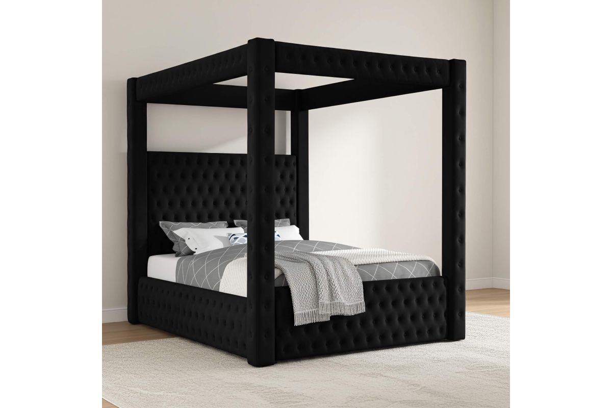 - Luxurious black velvet upholstery wraps the bed in soft, touchable comfort, evoking contemporary glamour and timeless appeal