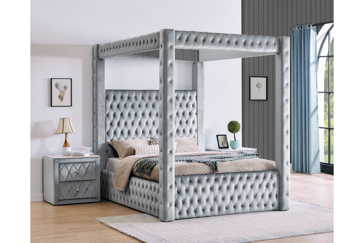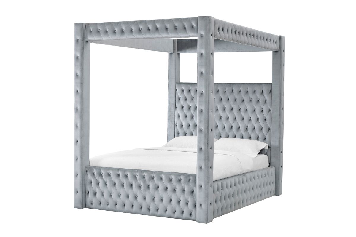 Transform your master suite into a haven of glamour with the Annabelle Grey Velvet King Canopy Bed by Crown Mark. Revel in the ambiance of a grand five-star retreat each time you enter your bedroom, as this showstopping centerpiece anchors your space with a sense of elevated drama and sophisticated comfort. The Annabelle bed blends plush, tactile luxury with bold architectural presence – from sun-drenched mornings to tranquil evenings, it sets the perfect stage for relaxation and indulgence. Layer in your favorite bedding, rich drapery, or keep it minimal for a boutique hotel aesthetic; this bed’s versatility shines in any luxury-minded home. Designed to captivate from every angle, it’s the ultimate statement piece for those who appreciate the finer things in interior décor.
