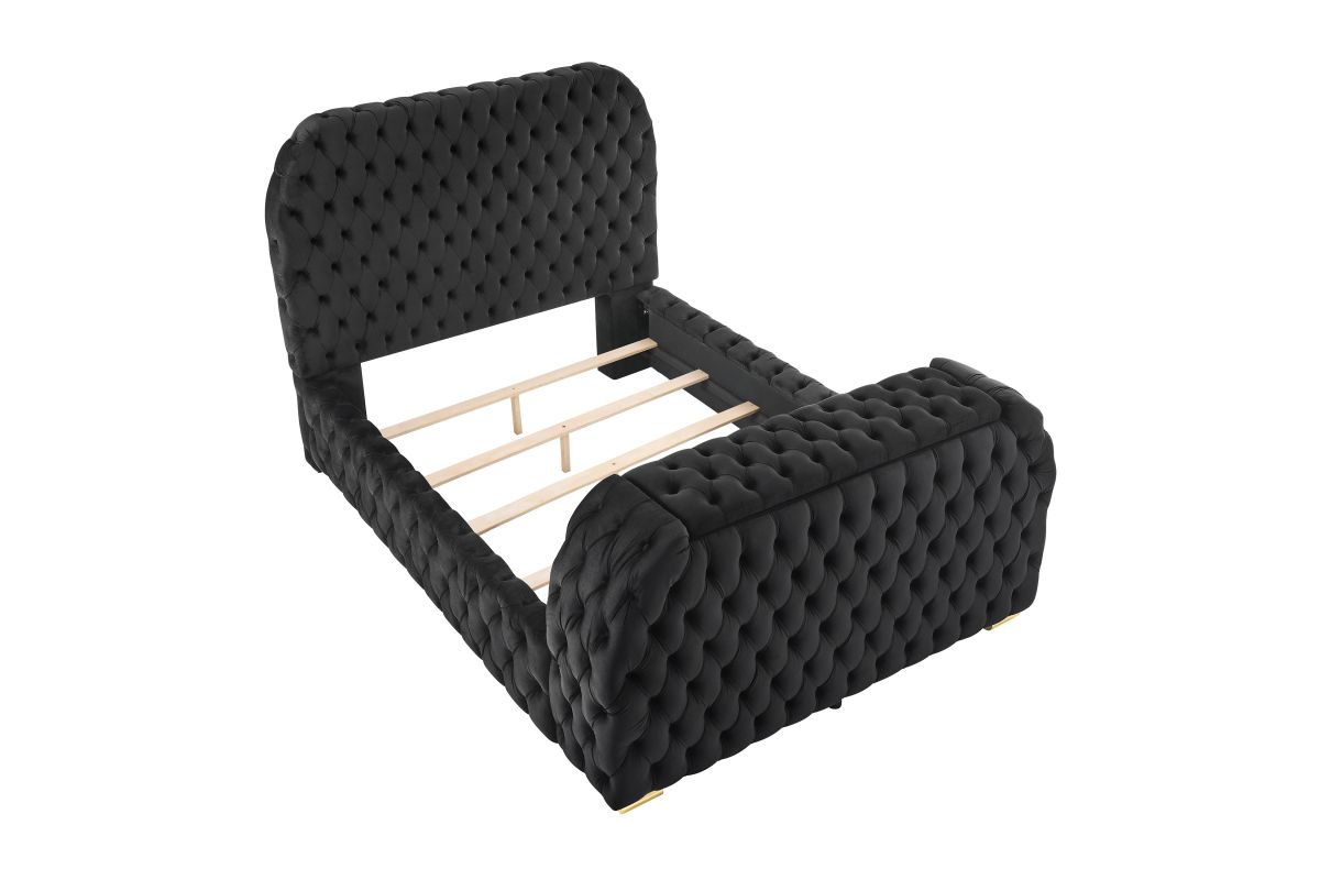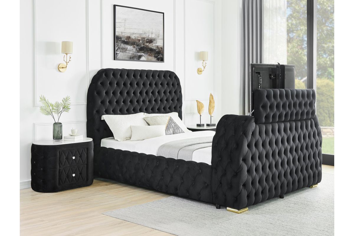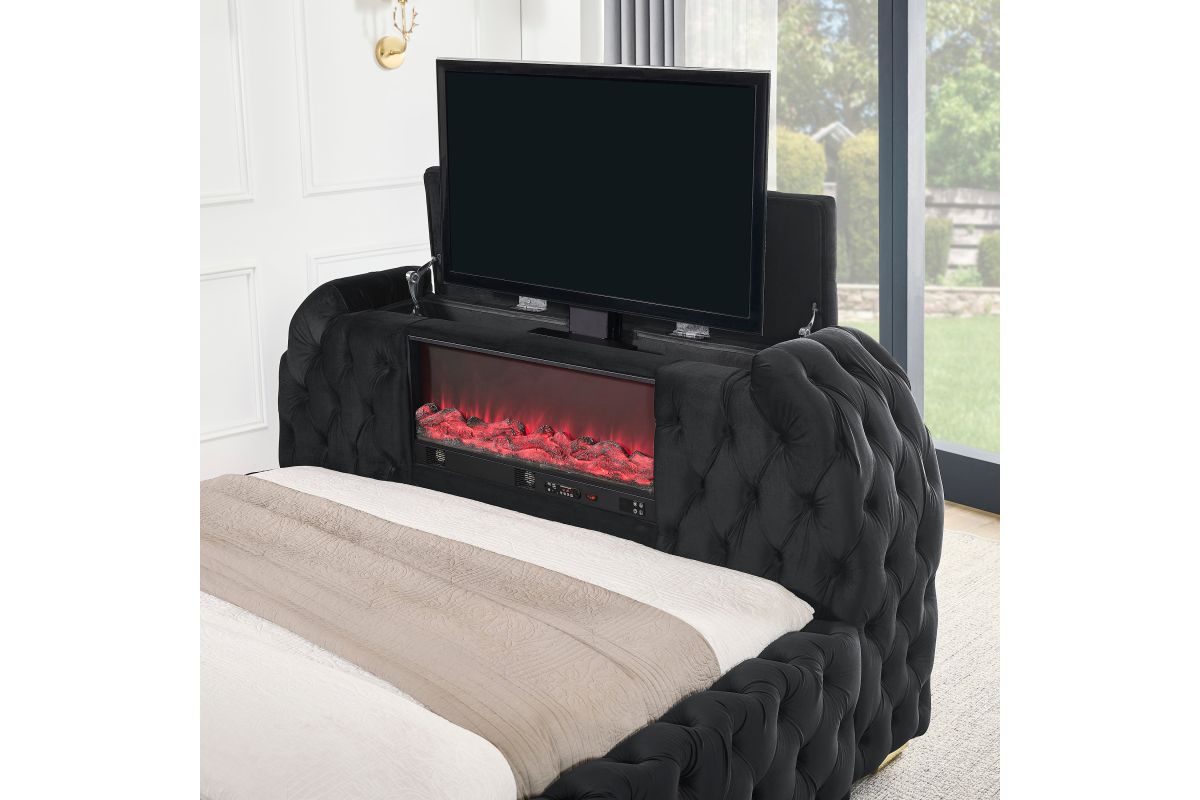 Indulge in the epitome of luxurious comfort and innovative design with this exquisite bed, a true masterpiece for those who appreciate both form and functionality in their sleeping quarters. Boasting a majestic, deeply tufted headboard that extends all the way to the edges, this bed is upholstered in sumptuous black velvet, offering a touch of opulence to any bedroom setting. The footboard features an integrated television lift mechanism, seamlessly blending entertainment with relaxation. Additionally, a built-in electric fireplace enhances the ambiance and provides a cozy, warm glow that invites you to unwind in style. The design is completed with subtle gold accents on the feet, adding a dash of elegance. This bed is perfect for those seequeen a luxurious retreat that combines modern technology with sophisticated design elements to create an unparalleled bedroom experience.
