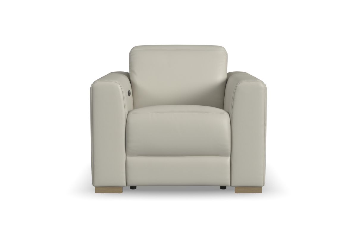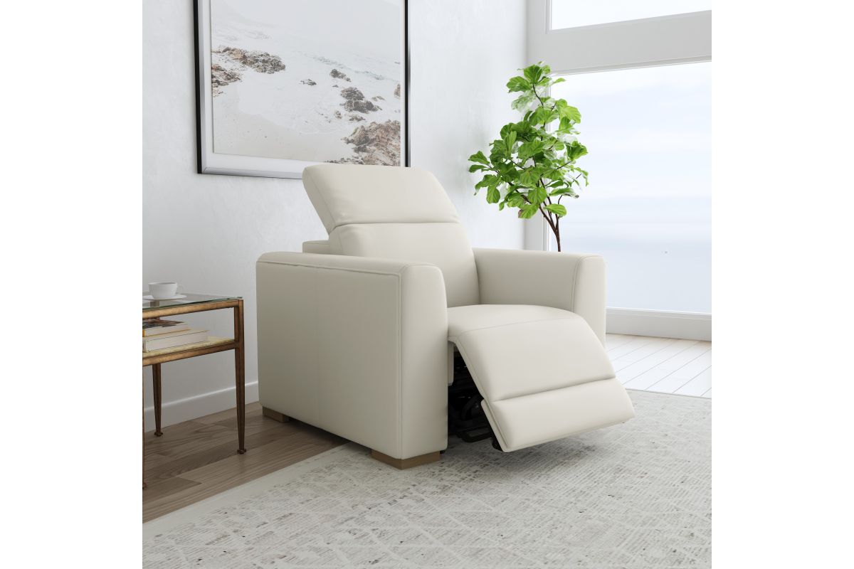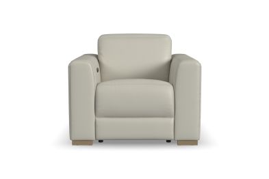 The luxurious look of upscale stationary furniture combines with functional adjustability with the Aurora power recliner with power headrest. Transform your living space into a stylish oasis for relaxation and surround yourself in contemporary comfort with design features such as soft, wide track arms and a low profile, stationary look with motion functionality. The power recline and headrest help you achieve maximum relaxation, while Zero Gravity technology gives you a feeling of weightlessness. At the heart of this chair's seat is Flexsteel's patented Blue Steel Spring™ provide lasting comfort and support. Upholstered in a high-quality, coconut milk white top-grain leather, the Aurora power recliner serves as a beautiful complement to any home.