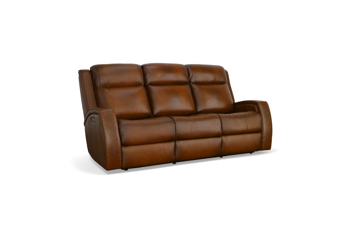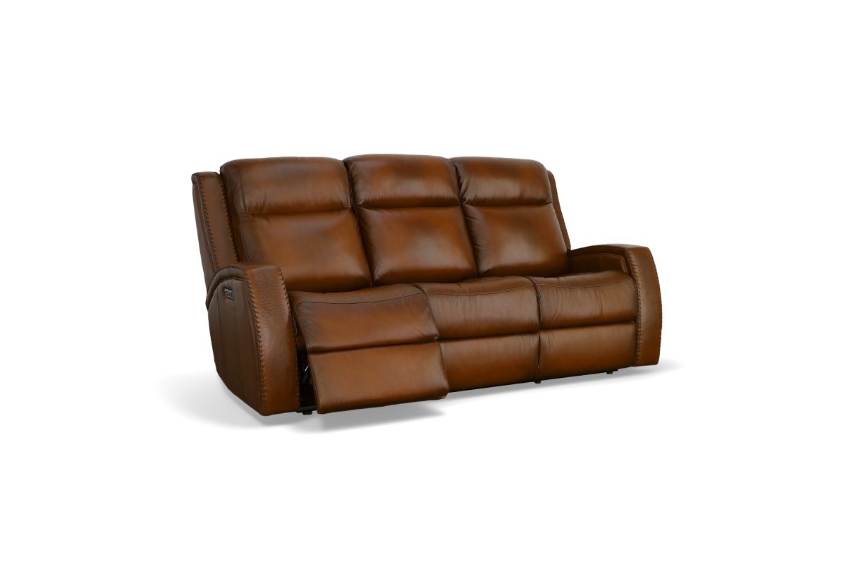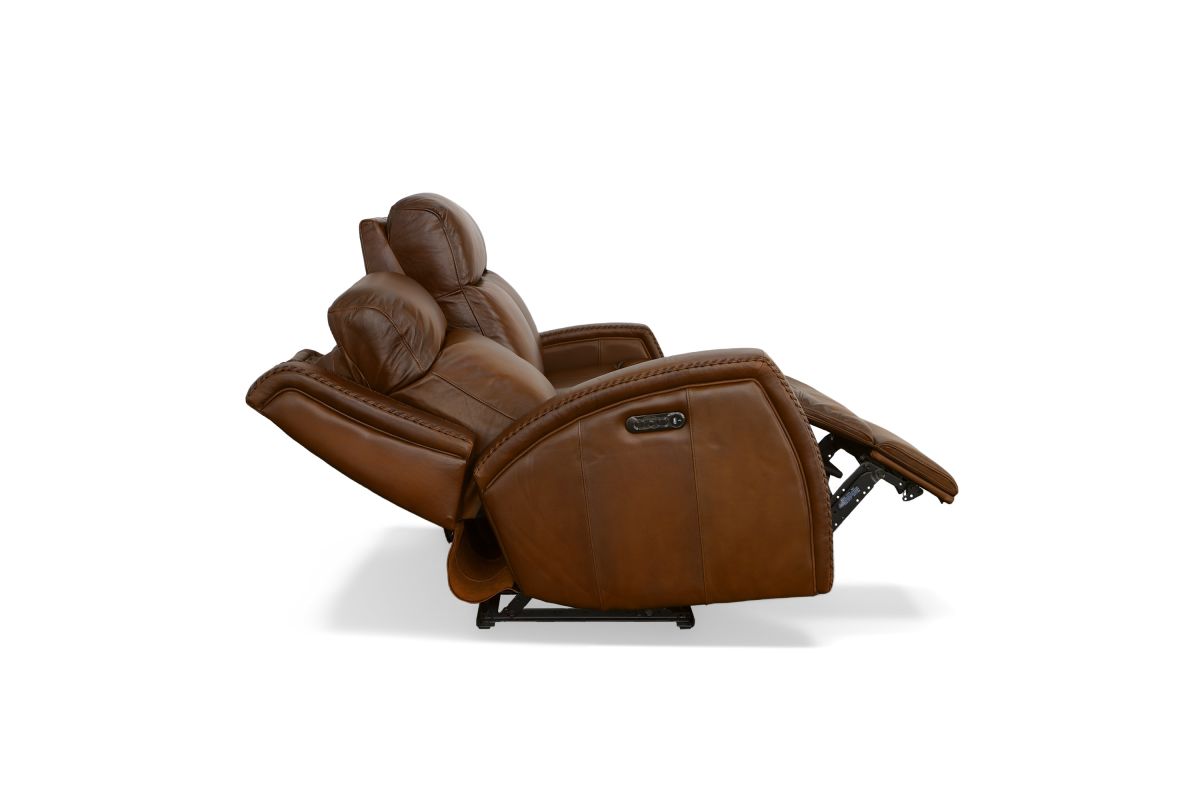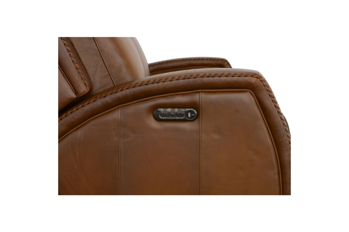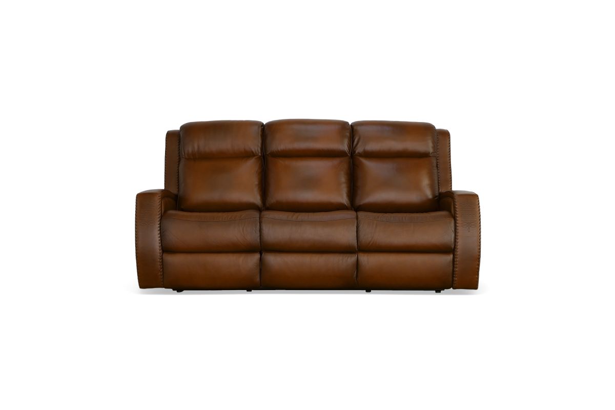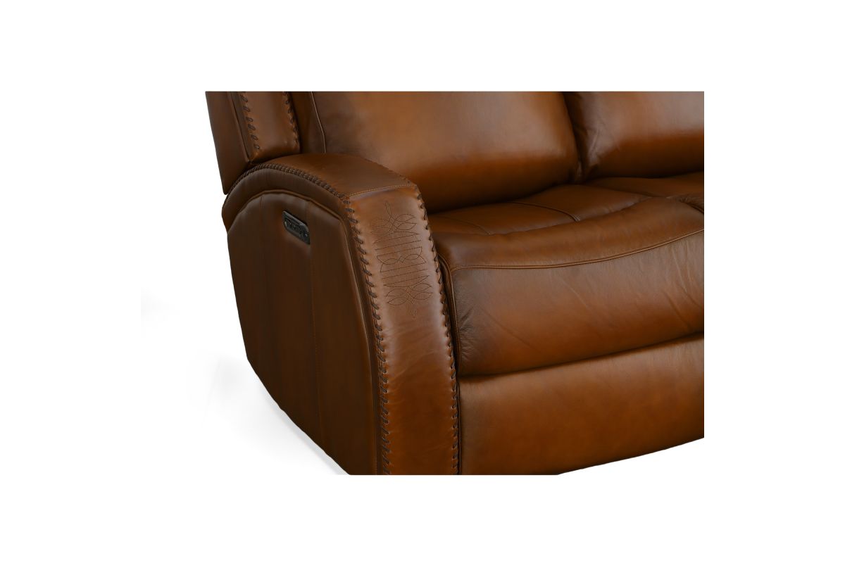 Infuse your living space with a touch of Western charm with the Mustang power reclining sofa with power headrests. Inspired by the rugged elegance of cowboy boot designs, this sofa features intricately stitched details along the arms that enhances its distinctive character. With power reclining and headrest support that adjusts independently, you can customize your relaxation experience. Flexsteel’s patented Blue Steel Spring™ seat system ensures enduring support and durability. Upholstered in rich, rust brown premium leather, this sofa brings both style and comfort to your home, creating a warm and inviting atmosphere.