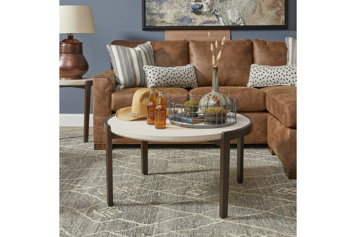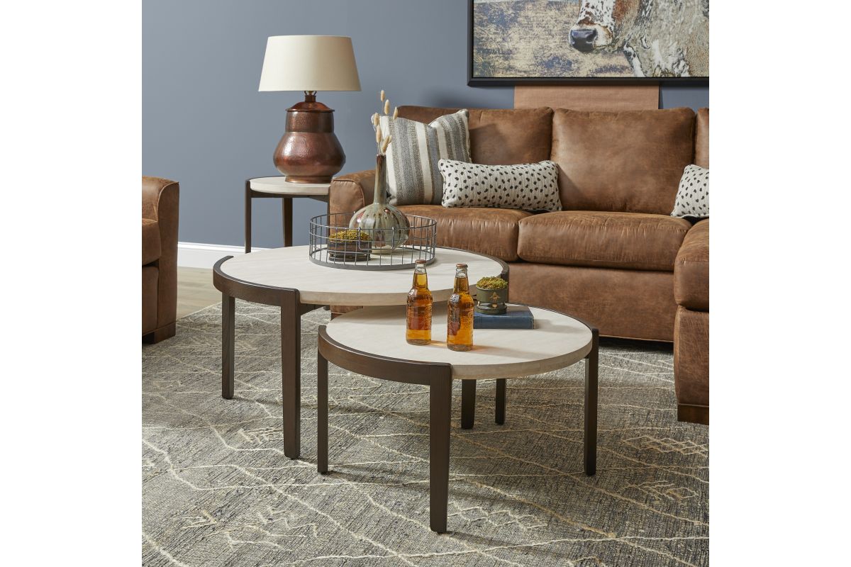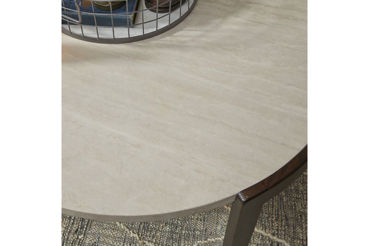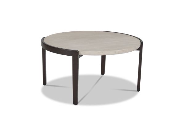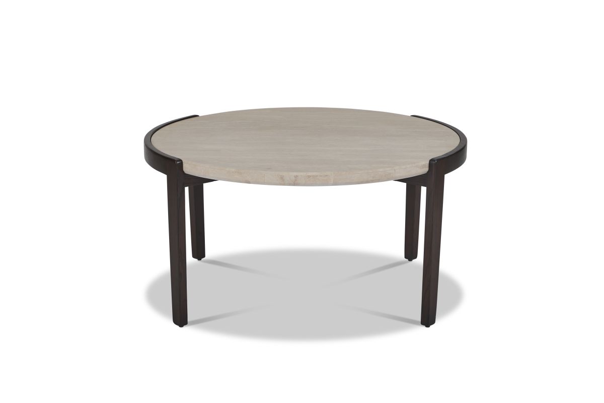 Elevate the look of your living space with the Palette round coffee table, an alluring blend of European design and nature-inspired beauty. A light travertine stone top rests upon a contrasting, curved wood base, evoking the illusion of a floating surface. Part of a table collection with three distinct heights and sizes, the Palette coffee table can be paired with other versions to create a layered, visually captivating look that expands surface space without crowding a room.