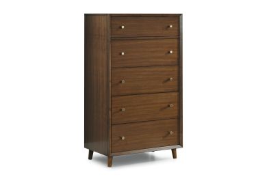Offering the quintessential mid-century modern profile with clean lines, chamfered edges, and tapered, splayed legs, this drawer chest is designed to coordinate with the different Ludwig beds in the collection. A warm, walnut finish adorns the Ludwig drawer chest, which offers five roomy drawers accented with round, brushed brass pulls. The upper drawer is felt-lined to keep contents protected and in place. Timeless design and high-quality construction ensure the Ludwig drawer chest can be enjoyed by future generations, while a smaller-size scale allows it to fit perfectly in any size bedroom.