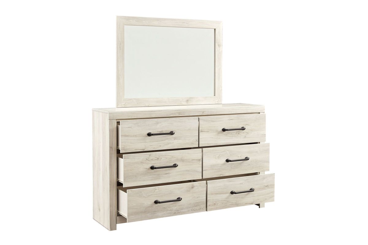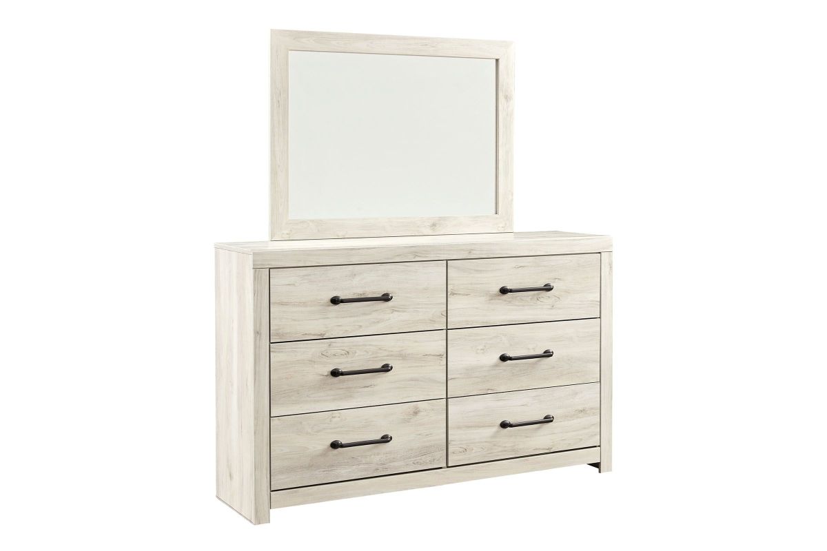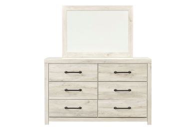 The rustic barn wood white finish over a replicated oak grain adds a unique touch to the Wilder Dresser with Mirror. The Wilder Dresser with Mirror offers 6 spacious drawers for storage. The dresser is accented with large-scale black matte drawer handles and the drawers are lined with a faux linen laminate for a clean and finished look. The framed mirror is attached to the back of the dresser.