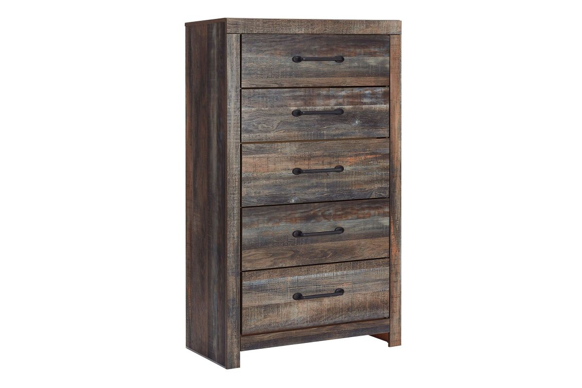 The rustic barn wood brown finish is accented by large scale black matte drawer handles. The 5 spacious and equal sized drawers are lined with a faux linen laminate for a clean and finished look. The Wilder Collection is perfect for any bedroom and offers a beautiful new look with clean lines and subtle design features that will satisfy any taste.