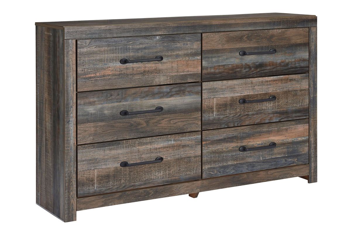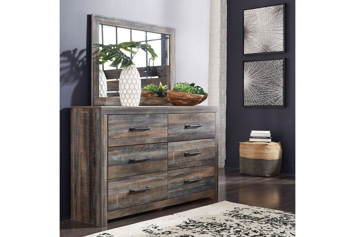 The rustic barn wood brown finish over a replicated oak grain adds a unique touch to the Wilder Dresser with Mirror. The Wilder Dresser with Mirror offers 6 spacious drawers for storage. The dresser is accented with large-scale black matte drawer handles and the drawers are lined with a faux linen laminate for a clean and finished look. The framed mirror is attached to the back of the dresser.