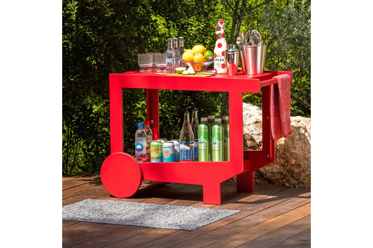 The Lollygagger Bar Cart may not take you and your friends around the city but it will certainly carry your favorite drinks around your deck without a complaint. We designed this cart to partner well with our Lollygagger Collection but it will pair equally well with any modern outdoor furniture, and sometimes it simply likes to carry drinks alone. The large wheels have a non-marking neoprene gasket to help create a smooth roll. Please Bar Cart responsibly.