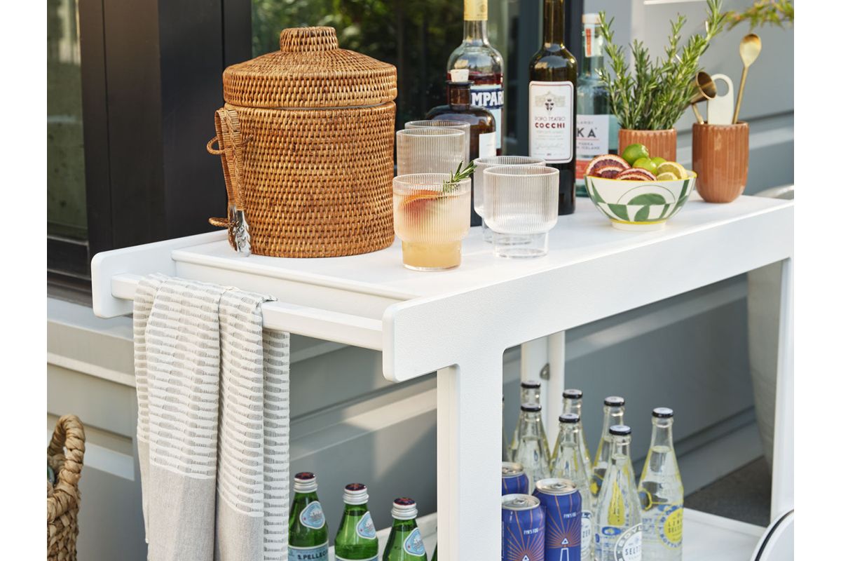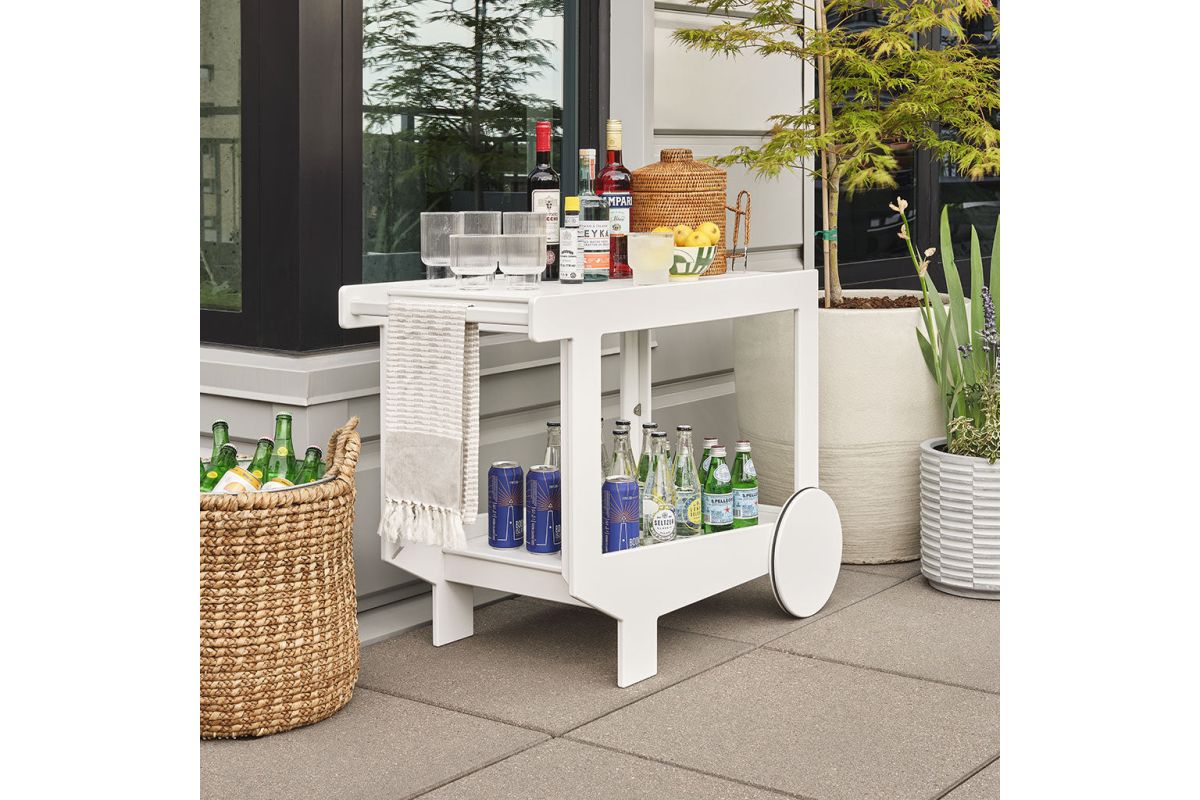 The Lollygagger Bar Cart may not take you and your friends around the city but it will certainly carry your favorite drinks around your deck without a complaint. We designed this cart to partner well with our Lollygagger Collection but it will pair equally well with any modern outdoor furniture, and sometimes it simply likes to carry drinks alone. The large wheels have a non-marking neoprene gasket to help create a smooth roll. Please Bar Cart responsibly.