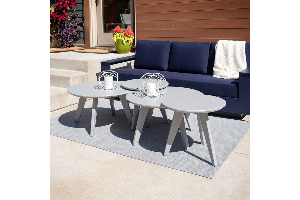 Part of Loll's Satellite Collection, this round outdoor end table measures 18 inches around the tabletop. Perfect for outdoor entertaining, the modern side table also comes in a larger, 26-inch version.