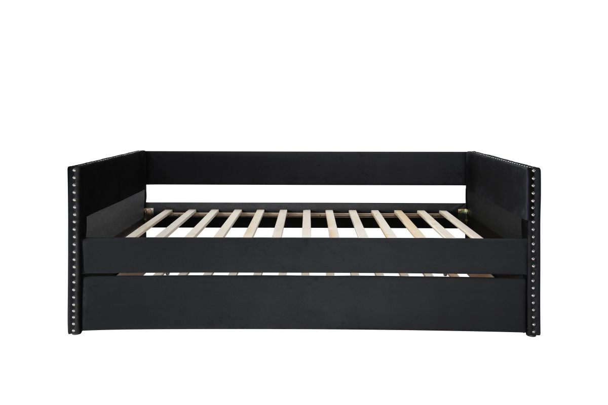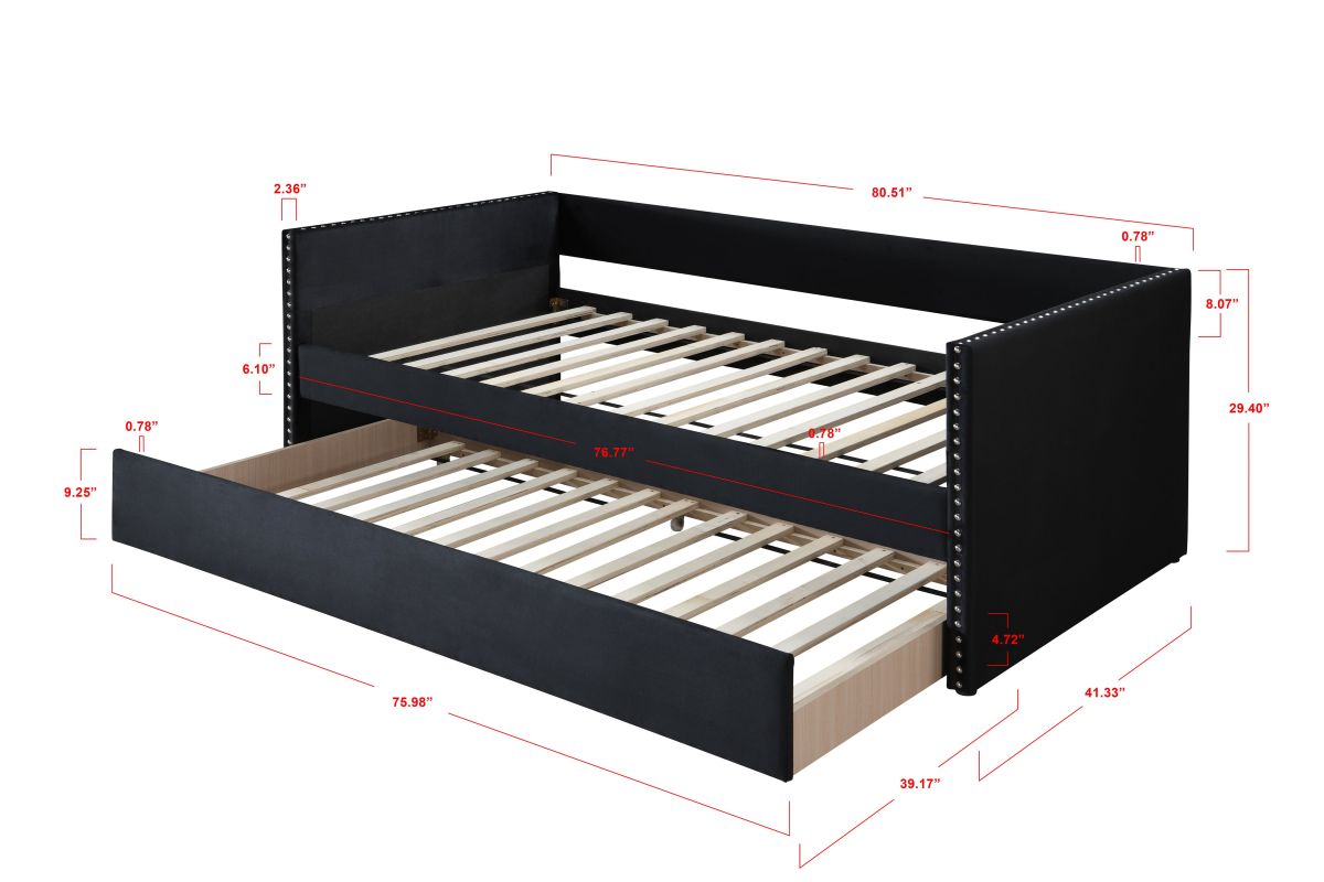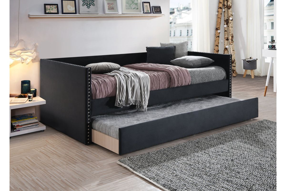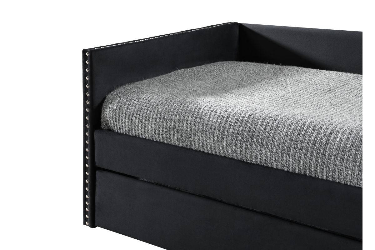 This Sadie Daybed by Crown Mark features nailhead trim, a smooth Black Velvet finish for a beautiful, timeless look. This charming daybed will certainly impress family and friends! Boasting Black Velvet finish, this daybed is a chic addition to your master suite or guest bedroom. This bed is beautifully designed. Use of fine quality wood further adds strength and durability to this bed. Perfect for apartments, guest rooms or anywhere you need a seat solution and place for guests to stay, this daybed is a great piece for your home. This daybed sports a transitional sofa look for when you need some relaxing space and can easily transform to 2 sleeping spots with the twin mattress and under-bed trundle.