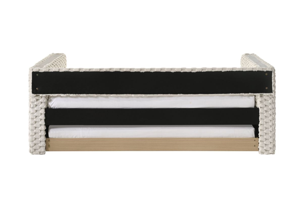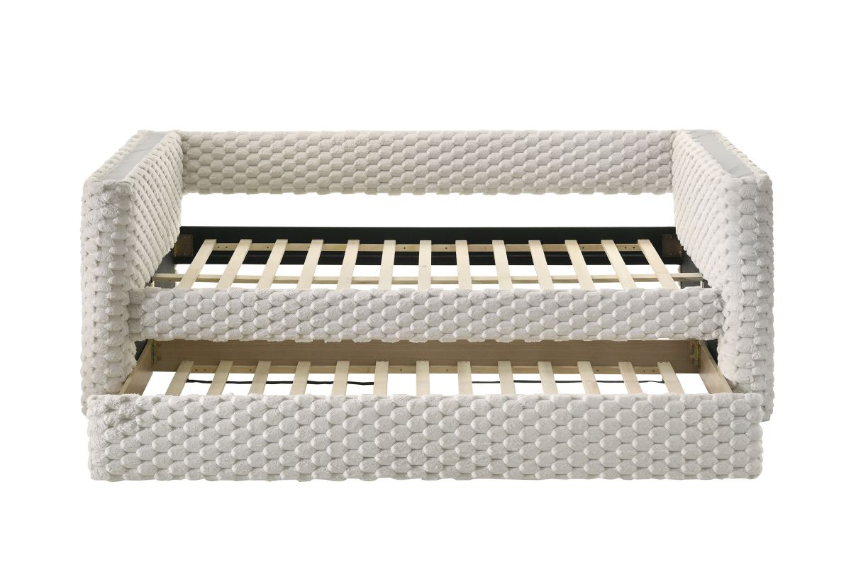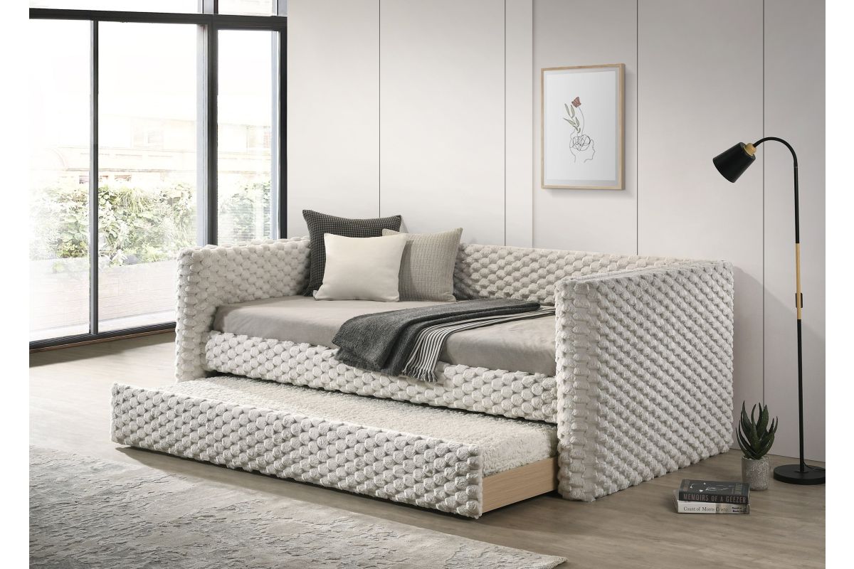 Discover the ultimate blend of modern elegance and practical design with the Brielle Dove Daybed with Trundle by Crown Mark. This stunning daybed is meticulously crafted to bring a sense of serene sophistication into any living space, bedroom, guest room, or studio. Imagine coming home after a long day to a room bathed in natural light, where the plush, textured upholstery of the Brielle Dove Daybed invites you to unwind in comfort and style. Its contemporary silhouette is adorned with a beautifully tactile boucle fabric in a soft white dove hue, offering tactile dimension and visual warmth to your décor. An ingenious marble accent graces the arms, providing a functional yet elegant spot to rest your favorite book, morning coffee, or decorative accents. Whether you’re hosting overnight guests or creating a cozy reading corner, the seamless pull-out trundle delivers an extra bed without sacrificing floor space or aesthetics. Perfect for those who appreciate refined modern living, the Brielle Dove Daybed is as beautiful as it is versatile. Built with premium materials and a design-forward vision, this piece elevates your home with both elevated style and everyday functionality, underscoring the expertise and innovation of Crown Mark.