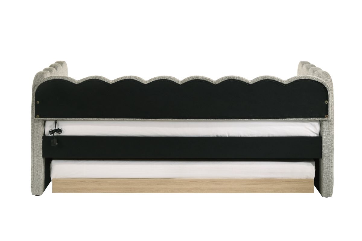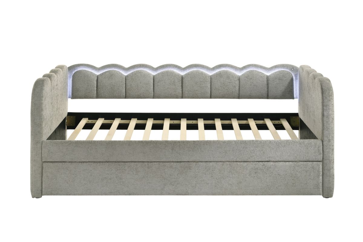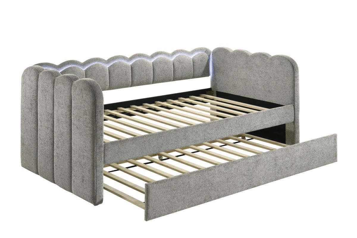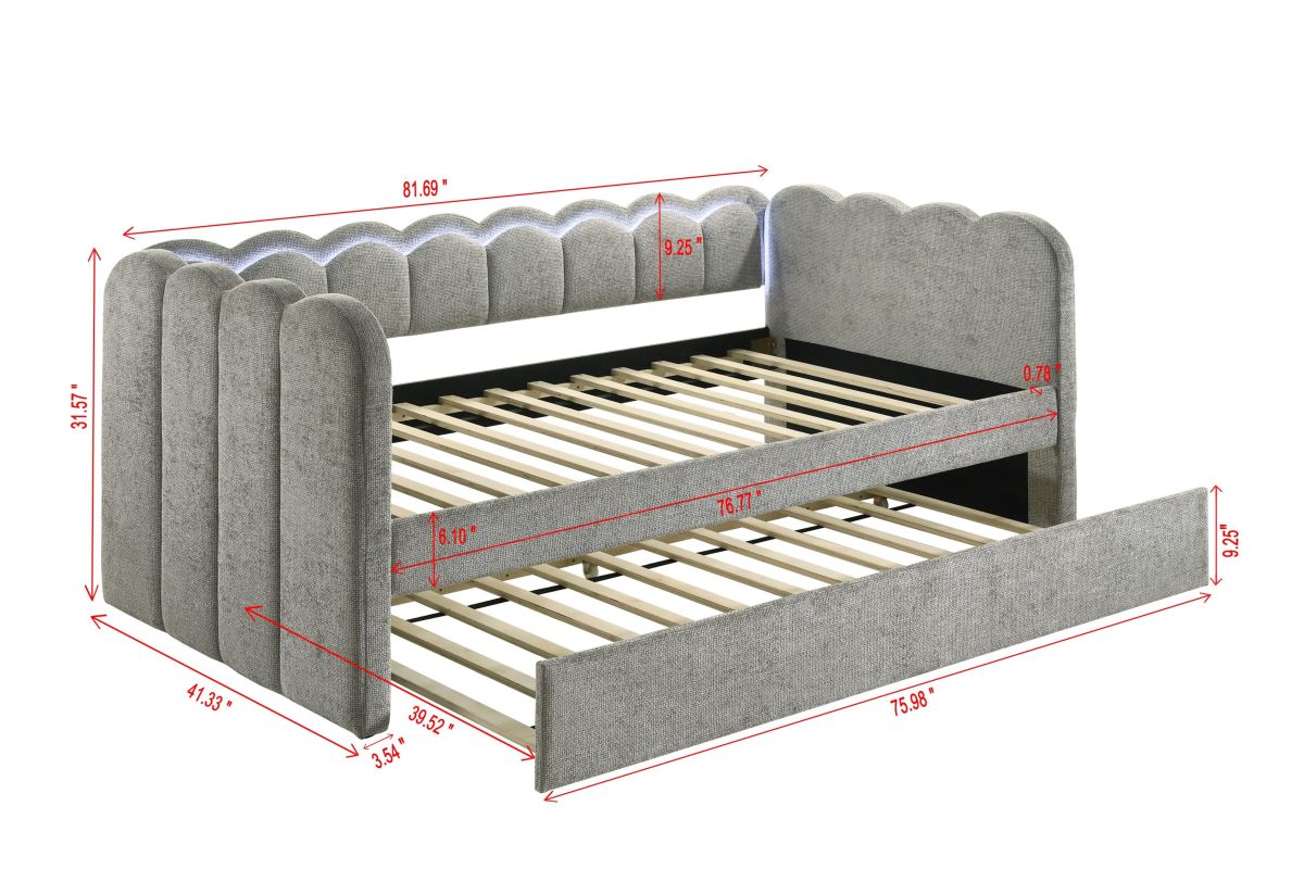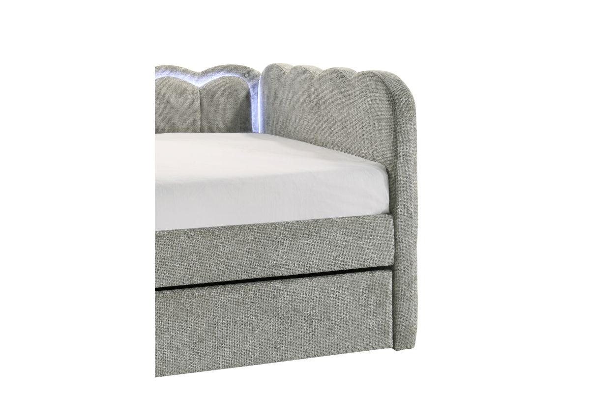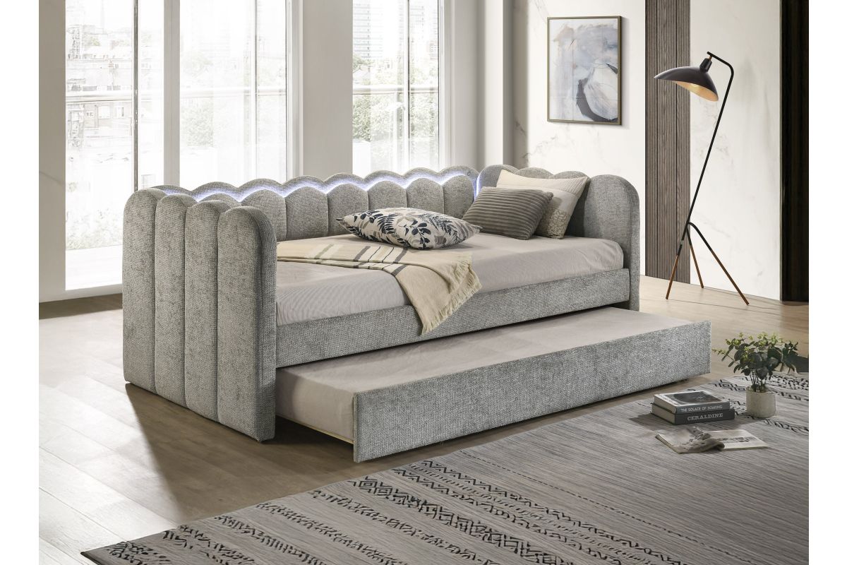 Experience the perfect blend of comfort and sophistication with this elegantly designed piece, crafted to bring both style and functionality to your space. Featuring a plush, scalloped silhouette with integrated LED lighting, this luxurious addition creates a soft and inviting ambiance, while the beautifully upholstered frame enhances its refined aesthetic. Designed with versatility in mind, it offers a spacious sleeping area and an integrated pull-out trundle, making it ideal for maximizing space without compromising on elegance. Whether placed in a bedroom, guest room, or lounge area, this stunning design effortlessly transforms any setting into a chic and cozy retreat.