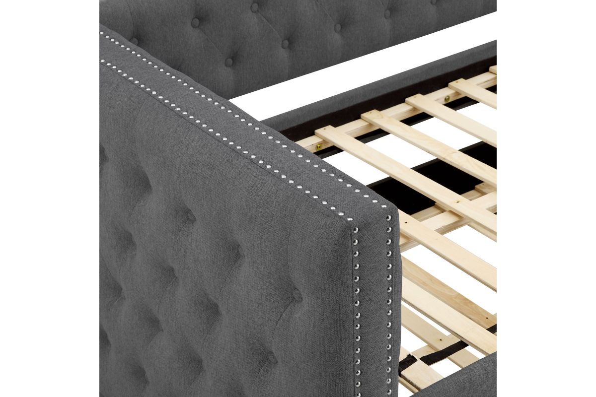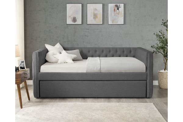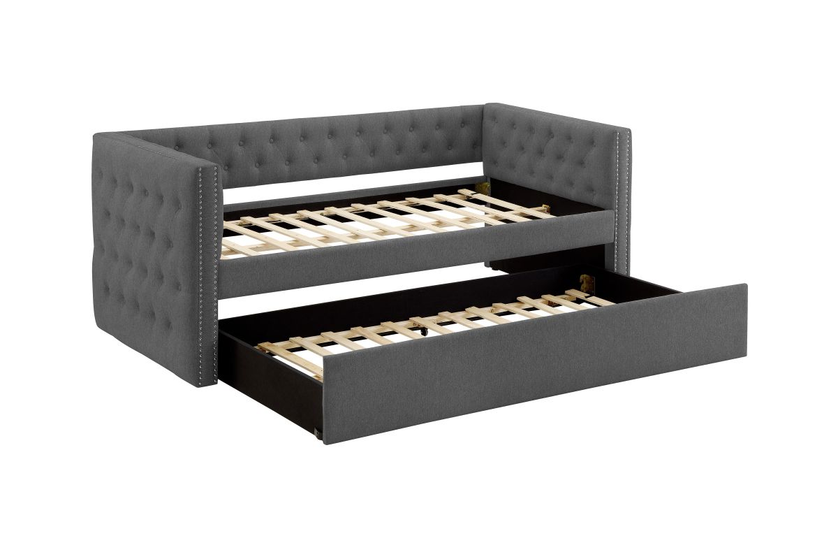 Discover the perfect fusion of sophisticated style and functional design with the Trina Gunmetal Gray Daybed with Trundle by Crown Mark. Ideal for modern living, this exquisite daybed becomes the centerpiece of your living space, where comfort meets contemporary flair. Imagine relaxing in your guest room, reading nook, or family lounge as sunlight filters through large windows, casting a warm glow over the soft, velveteen upholstery. Chic button tufting and elegant nailhead trim add a tasteful touch of luxury, while the clean lines and gunmetal gray palette ensure seamless integration into diverse interior themes—from sleek urban lofts to cozy transitional homes. A practical pull-out trundle makes hosting overnight visitors effortless, giving you versatility without compromising style.