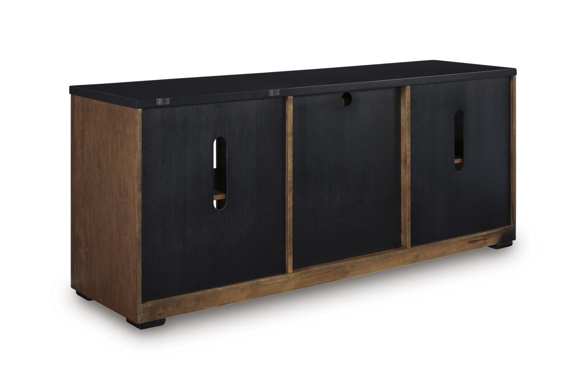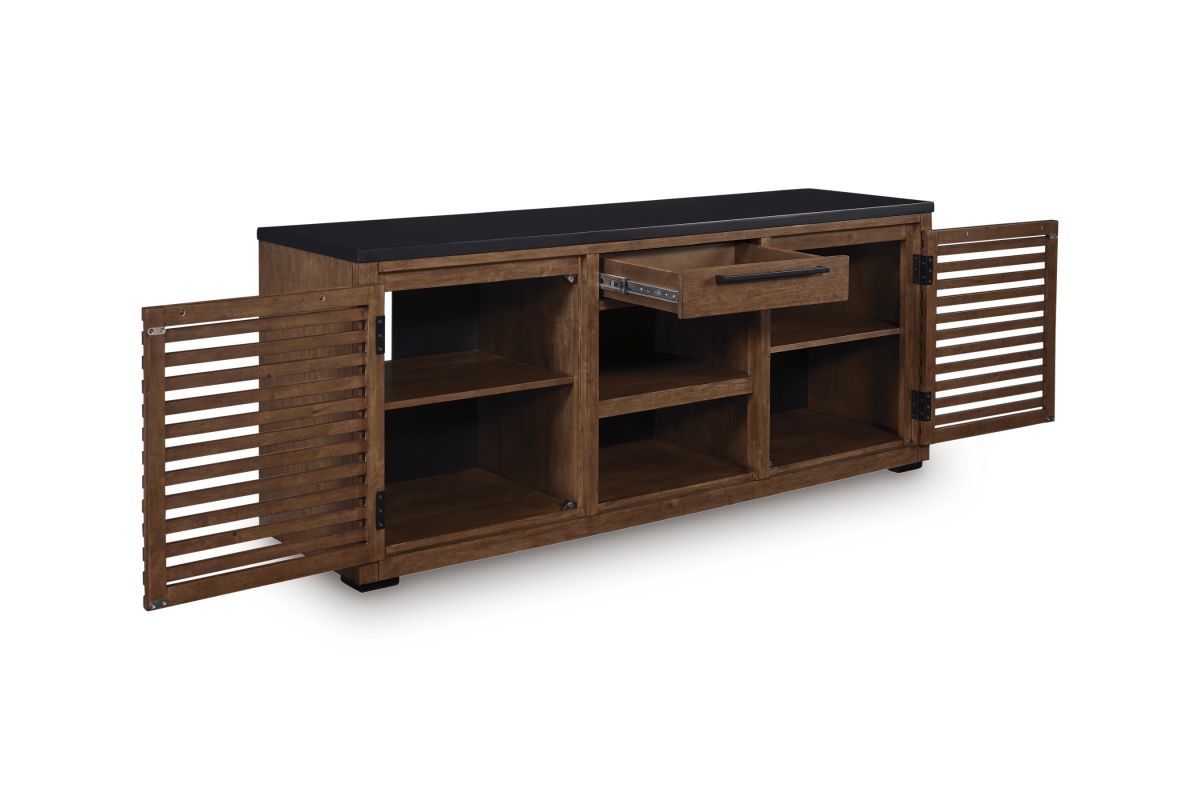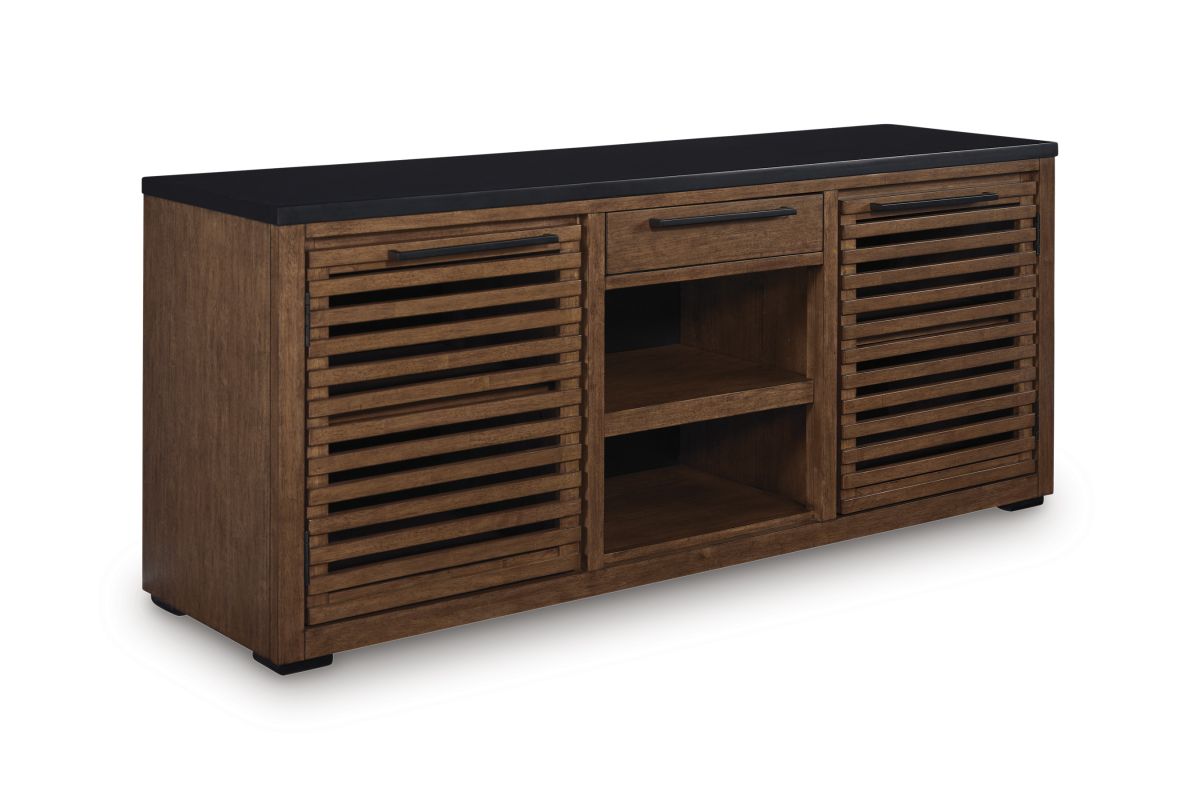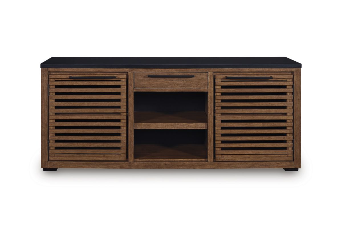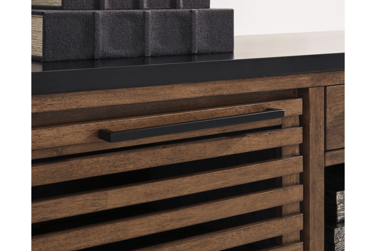 Double down on casual chic with the two-tone look of this credenza. With its warm brown and matte black finishes, it reflects your eye for modern design. The trend-right slatted styling on its doors brings added charm. And with the credenza's adjustable shelves, open storage and accessories drawer, keeping office essentials organized is a breeze.