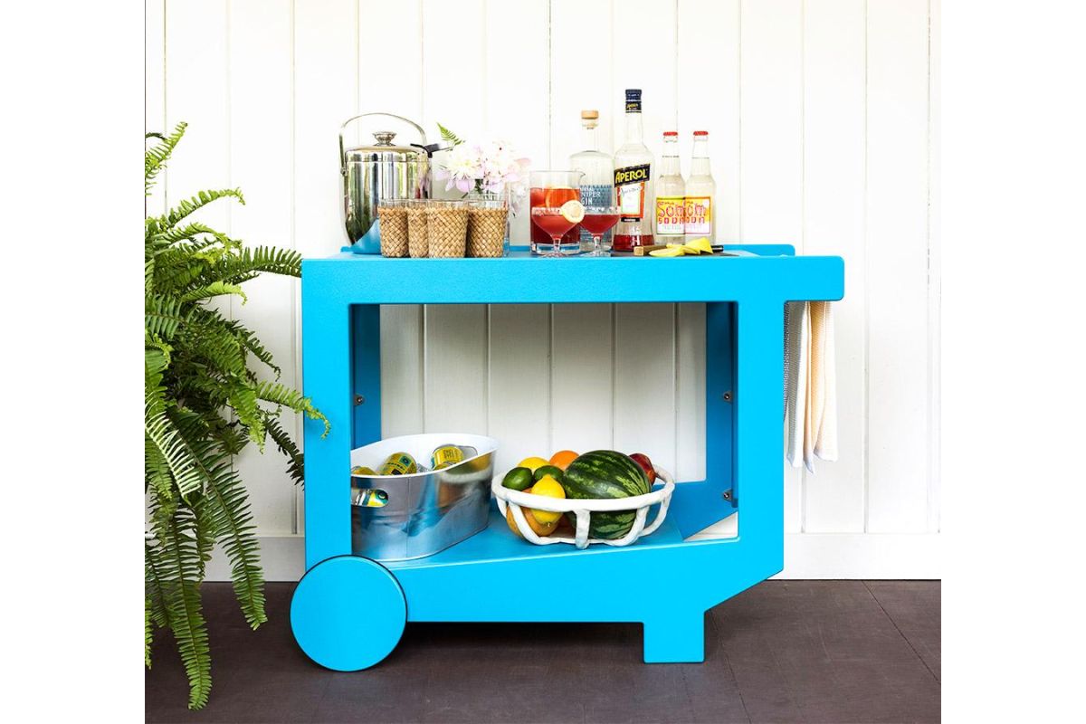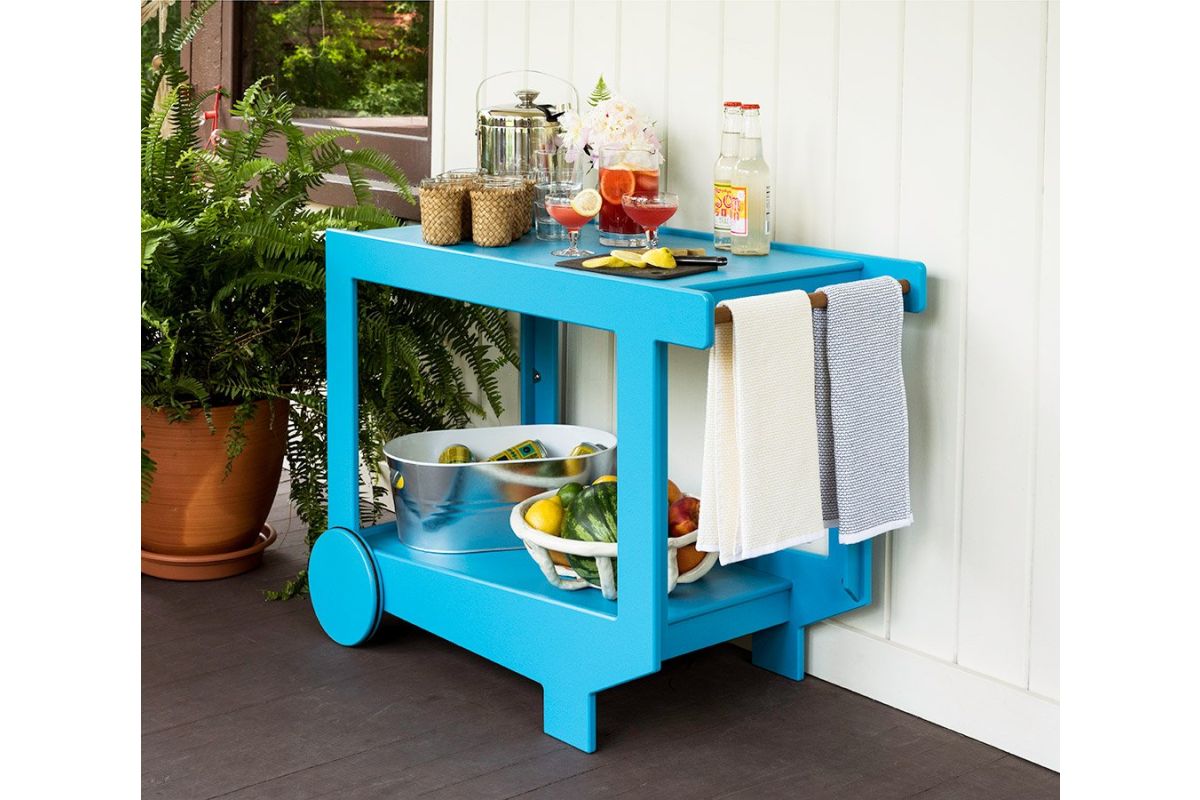 The Lollygagger Bar Cart may not take you and your friends around the city but it will certainly carry your favorite drinks around your deck without a complaint. We designed this cart to partner well with our Lollygagger Collection but it will pair equally well with any modern outdoor furniture, and sometimes it simply likes to carry drinks alone. The large wheels have a non-marking neoprene gasket to help create a smooth roll. Please Bar Cart responsibly.