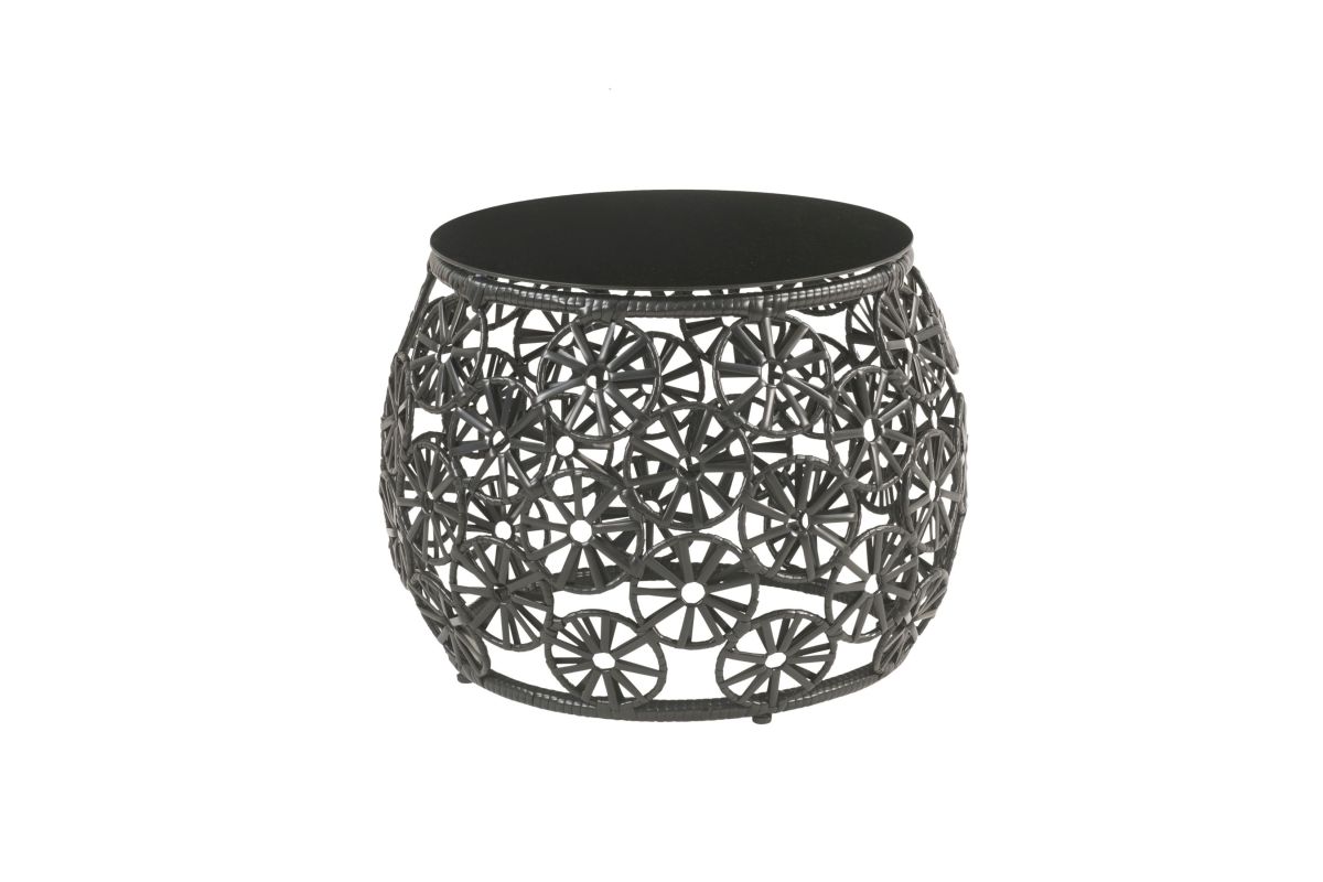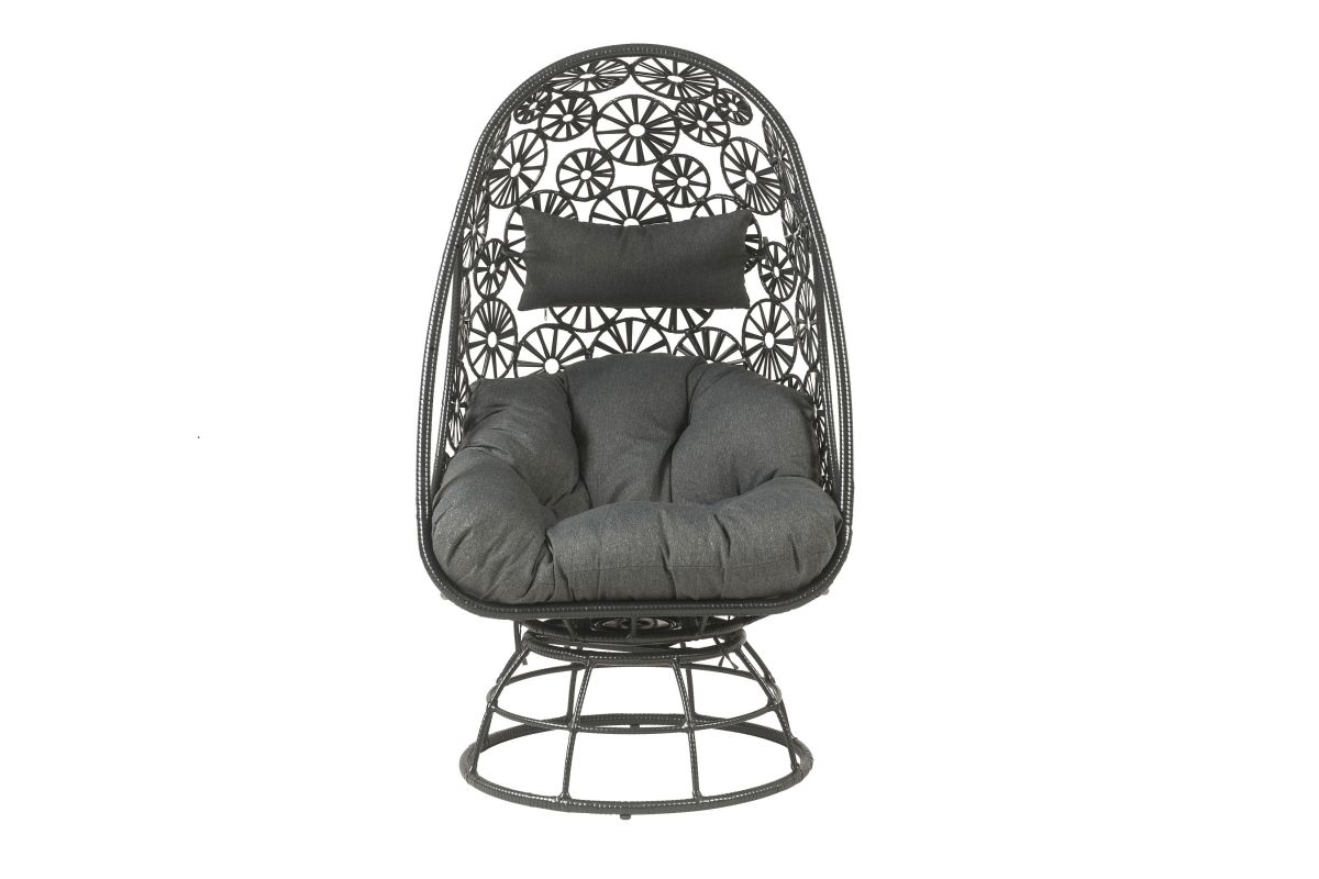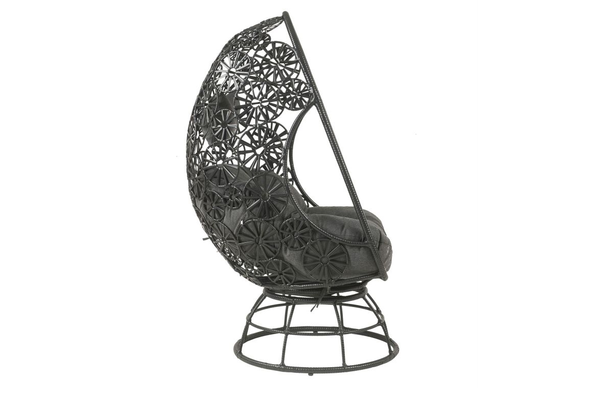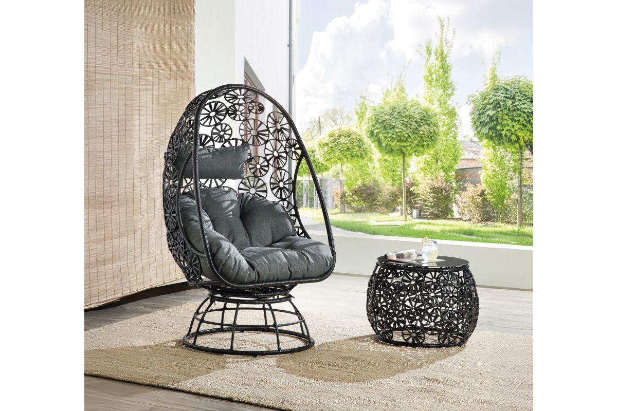 Elegant, airy wickerweaving work offers a lovely retreat to relax your body and soothe your mind. Black wicker frame with metal base highlights the fabulously airy and sturdy construction. Teardrop shaped design combines beautiful floral accents to create a sophisticated look. The additional seat cushion will make you feel so comfortable and relaxed lounging in this chair. Complementing side table makes a great place to rest your drink or book with its glass tabletop and stable drum base. Discover a dreamy oasis to stay with Hikre Patio Lounge Chair & Side Table.