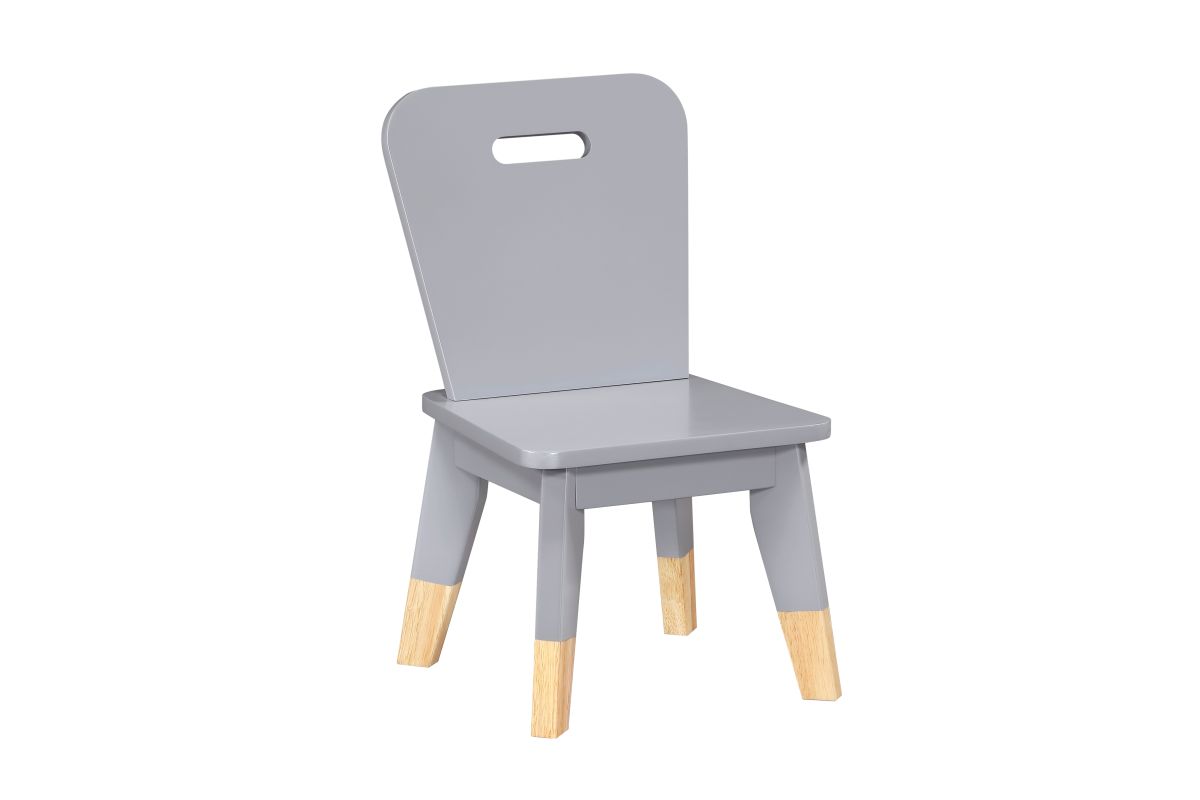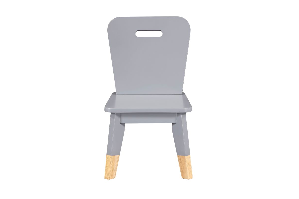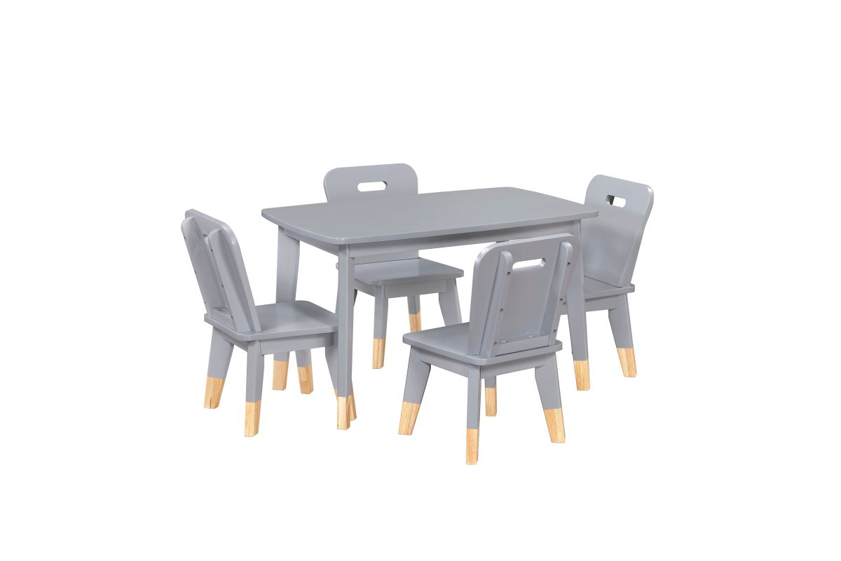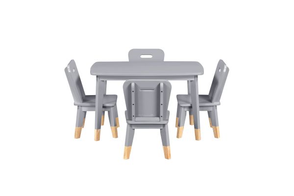 - Chairs feature a 2-tone finish (Grey and natural wood).