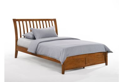 The Nutmeg Platform Bed brings clean, contemporary style to the bedroom with its gently curved slat headboard and flared legs, creating a look that's timeless yet modern. Crafted from durable solid rubberwood and finished in your choice of White, Stonewash, Natural, Cherry, or Chocolate, it's built to last through years of nightly use.