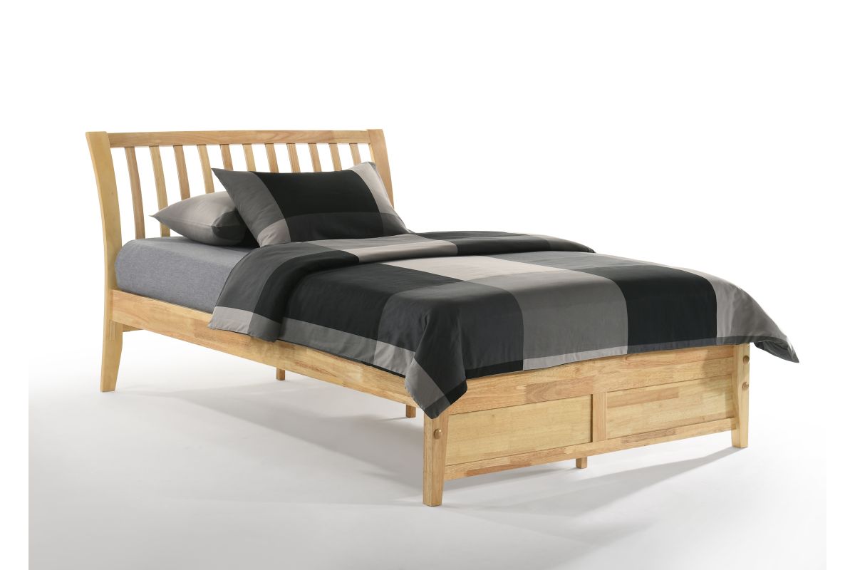 The Nutmeg Platform Bed brings clean, contemporary style to the bedroom with its gently curved slat headboard and flared legs, creating a look that's timeless yet modern. Crafted from durable solid rubberwood and finished in your choice of White, Stonewash, Natural, Cherry, or Chocolate, it's built to last through years of nightly use.