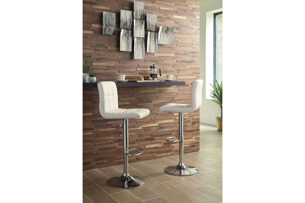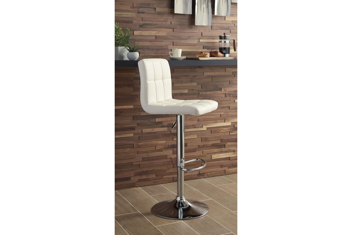 Here's a bar stool that rises to the occasion. It is sleek and modern with a chrome-tone finish. Square-tufted, bone-colored faux leather upholstery makes this bar stool pop. It easily adjusts from counter to pub height making it as versatile as it is attractive. This tall swivel bar stool is a perfect seat for any trendy home bar or game room. Assembly required.