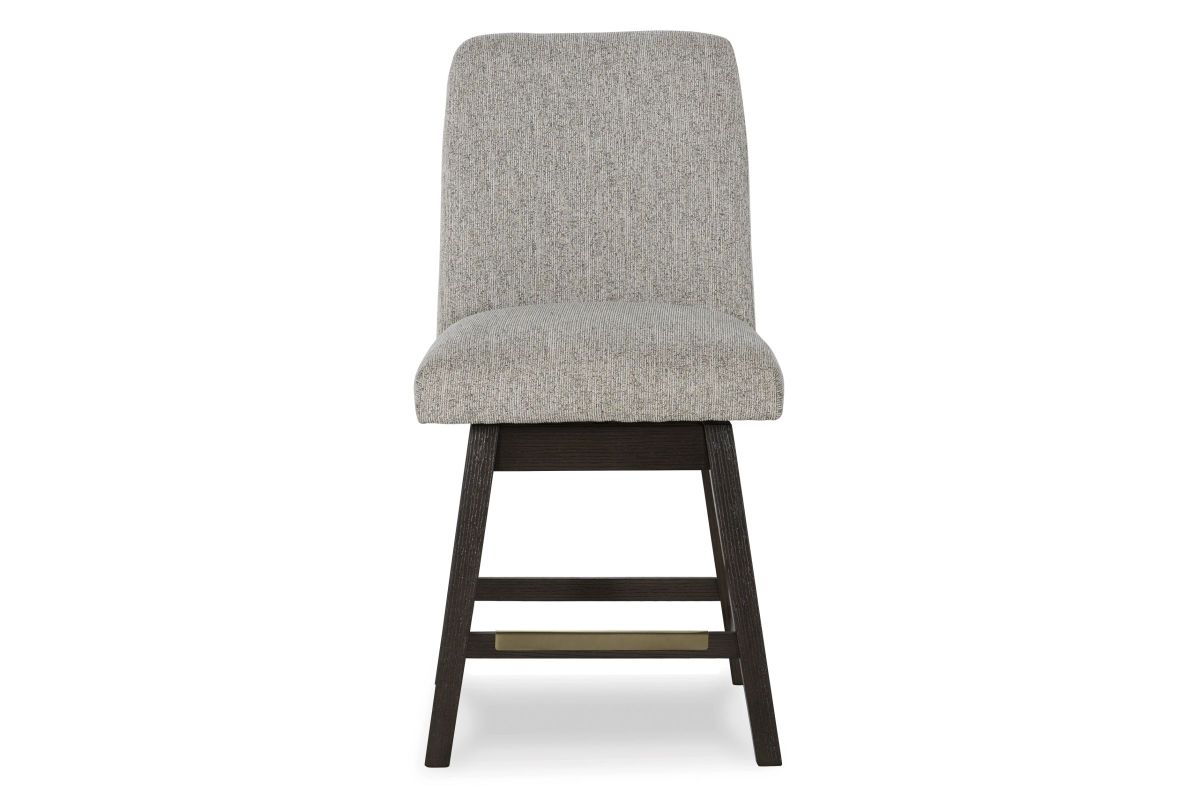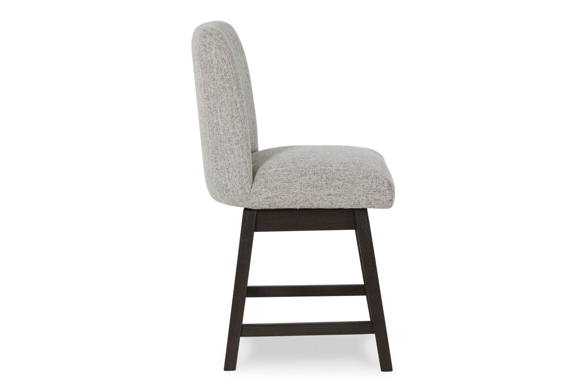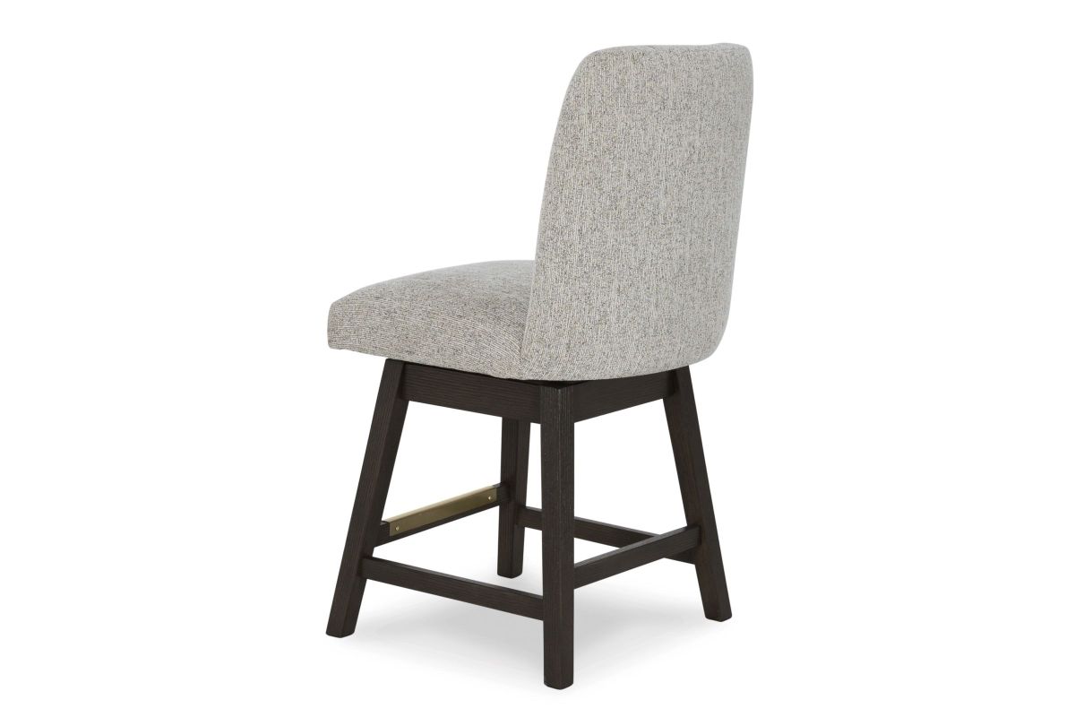 Dressed to thrill, this counter height bar stool offers a high-design look at a down-to-earth price. Ultra-sleek lines are accentuated with a dark waxy brown oak-tone finish that's so easy on the eyes. Suitably upholstered in a tweed-like neutral fabric, the softly contoured back design is tailor-made for comfort. Whether it's part of a dining arrangement or used as extra seating, this timeless bar stool has a look that's made to last.