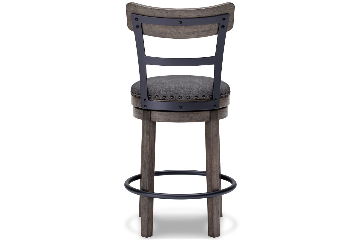 Bring a relaxed yet refined sense of good taste to a space with this upholstered swivel bar stool. The sturdy wood frame with contoured backrest is beautified with an antiqued gray wash finish that's easy on the eyes. Rest assured, this bar stool caters to your comfort with a cushioned seat with gray textured fabric accentuated with nailhead trim. Sensible swivel design keeps you in the flow of conversation.