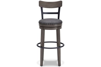 Bring a relaxed yet refined sense of good taste to a space with this upholstered swivel bar stool. The sturdy wood frame with contoured backrest is beautified with an antiqued gray wash finish that's easy on the eyes. Rest assured, this bar stool caters to your comfort with a cushioned seat with gray textured fabric accentuated with nailhead trim. Sensible swivel design keeps you in the flow of conversation. Assembly required.