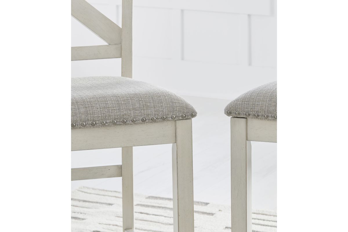 This counter height bar stool is sure to impress come mealtime. With its white finish and light gray upholstery, farmhouse-style seating has never been so fashionable. All that's missing is you and your family.