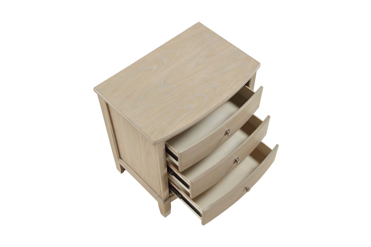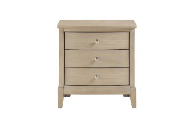 Add a touch of rustic charm and practical storage to your bedside with this beautifully crafted nightstand. Featuring a warm beige finish and made from a blend of Mindy veneer, wood, and engineered wood, this piece seamlessly complements any farmhouse or traditional bedroom decor. The three spacious drawers are constructed with durable dovetail joints and operate on smooth ball-bearing glides, ensuring effortless access to your belongings. Each drawer is accented with a stylish satin nickel tone knob, providing a clean, elegant contrast to the distressed finish. Delivered fully assembled, this nightstand is ready to use right out of the box, making it the perfect hassle-free addition to your home.