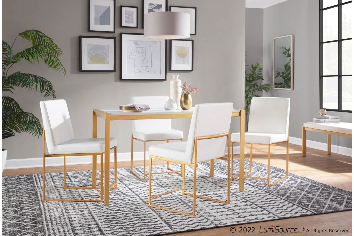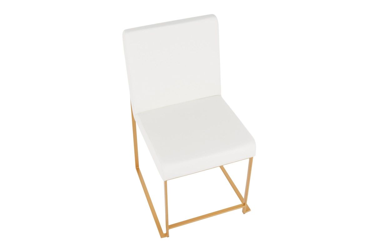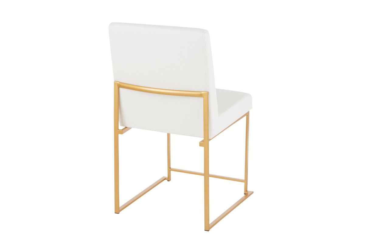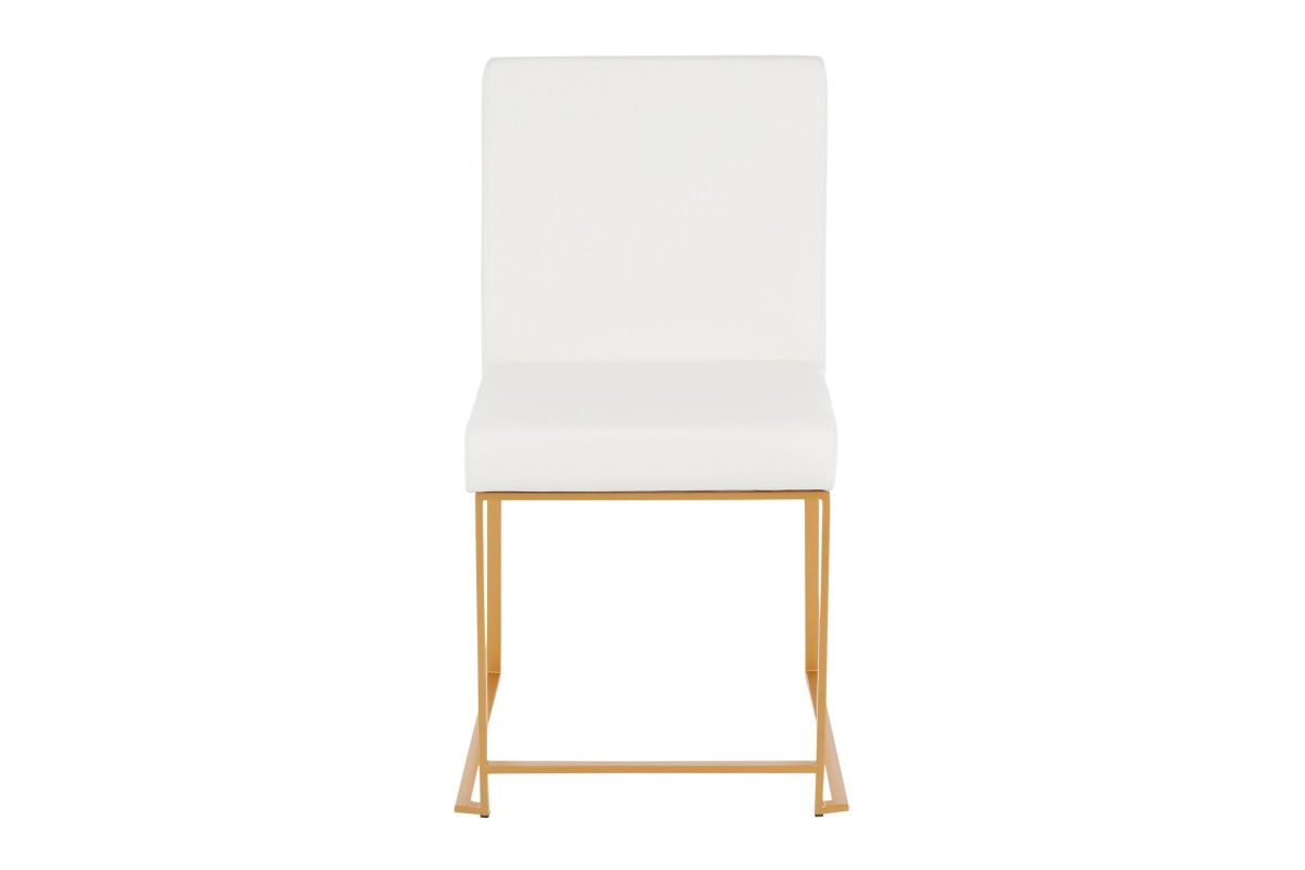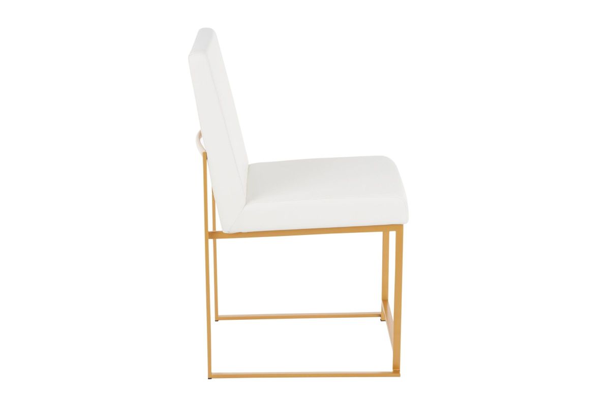 Modern elegance at its finest, the Fuji High Back Dining Chair features an extra-wide (and extra comfortable) upholstered seat, high padded backrest, and stylish metal frame. The perfect dining chair, the Fuji is multi-functional and can be used as extra seating in a sitting room or as a stylish office chair. Available in stainless steel or gold metal frame and a variety of sleek upholstery colors. Pair with the Fuji Dinette Table for a complete look.