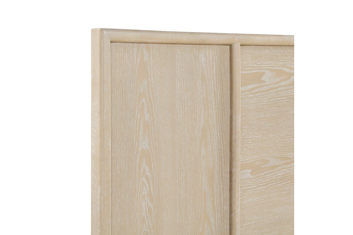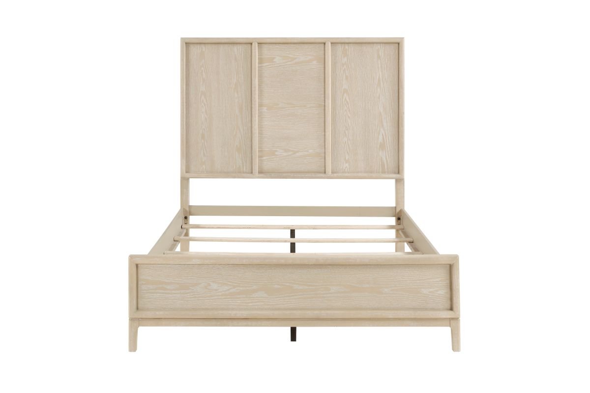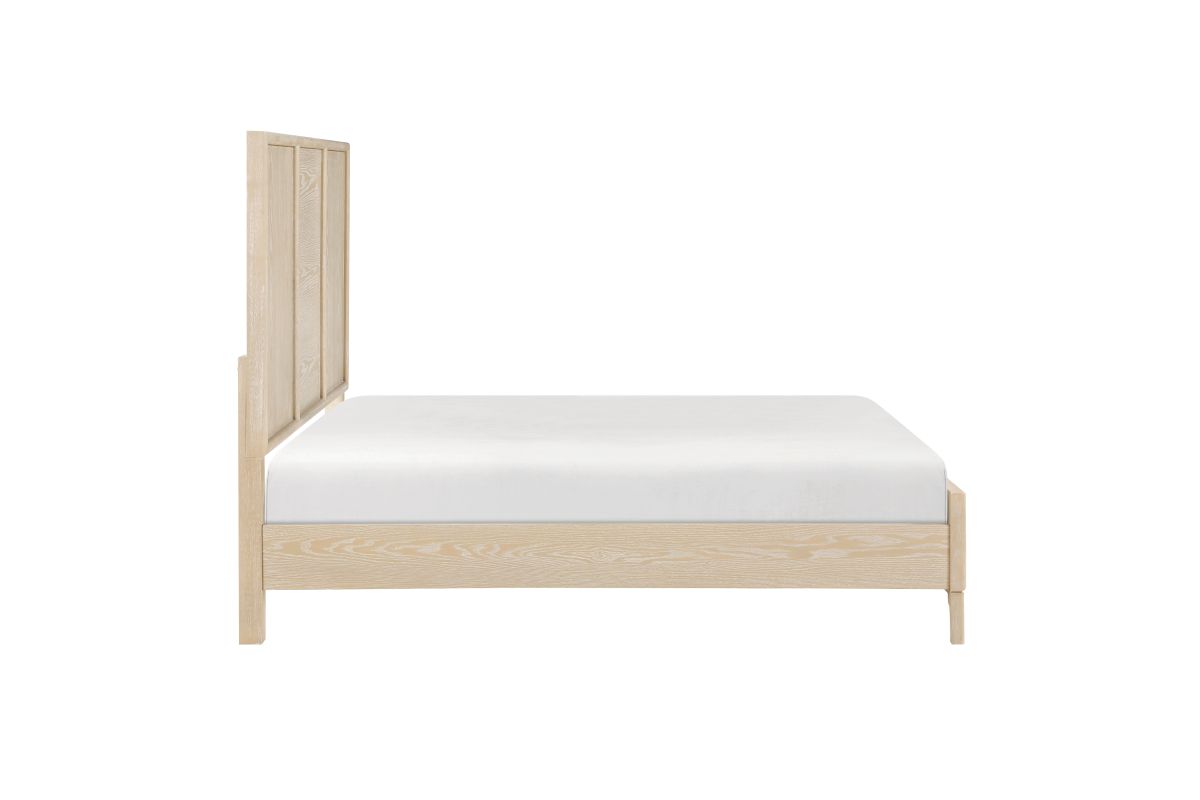 Introduce a serene, organic aesthetic to your sleeping space with this beautiful bedroom collection, finished in a soothing light brown oak veneer. The centerpiece is an elegant panel bed, featuring a distinctive three-panel headboard that highlights the natural wood grain. Complementing the bed are matching case goods—including the nightstand, 6-drawer dresser, 5-drawer chest, and square dresser mirror—all crafted with durable oak veneer. The case goods are built for longevity, featuring sturdy dovetail drawers that operate on ball-bearing glides and are accented with sleek black nickel-tone bar pulls, creating a calm, sophisticated, and highly functional sanctuary.