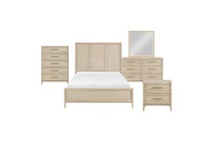 Introduce a serene, organic aesthetic to your sleeping space with this beautiful Queen panel bed. Crafted from a durable blend of wood and engineered wood and finished with a genuine oak veneer, this bed frame showcases the natural beauty of wood grain in a soothing light brown tone, perfect for a coastal, farmhouse, or transitional look. The headboard features a distinctive three-panel design, adding visual height and interest to the piece. This complete bed set includes the stylish headboard, matching footboard, and sturdy side rails, providing a solid foundation ready for your required box spring or foundation and mattress. This bed is the perfect centerpiece for a calm and sophisticated bedroom retreat.