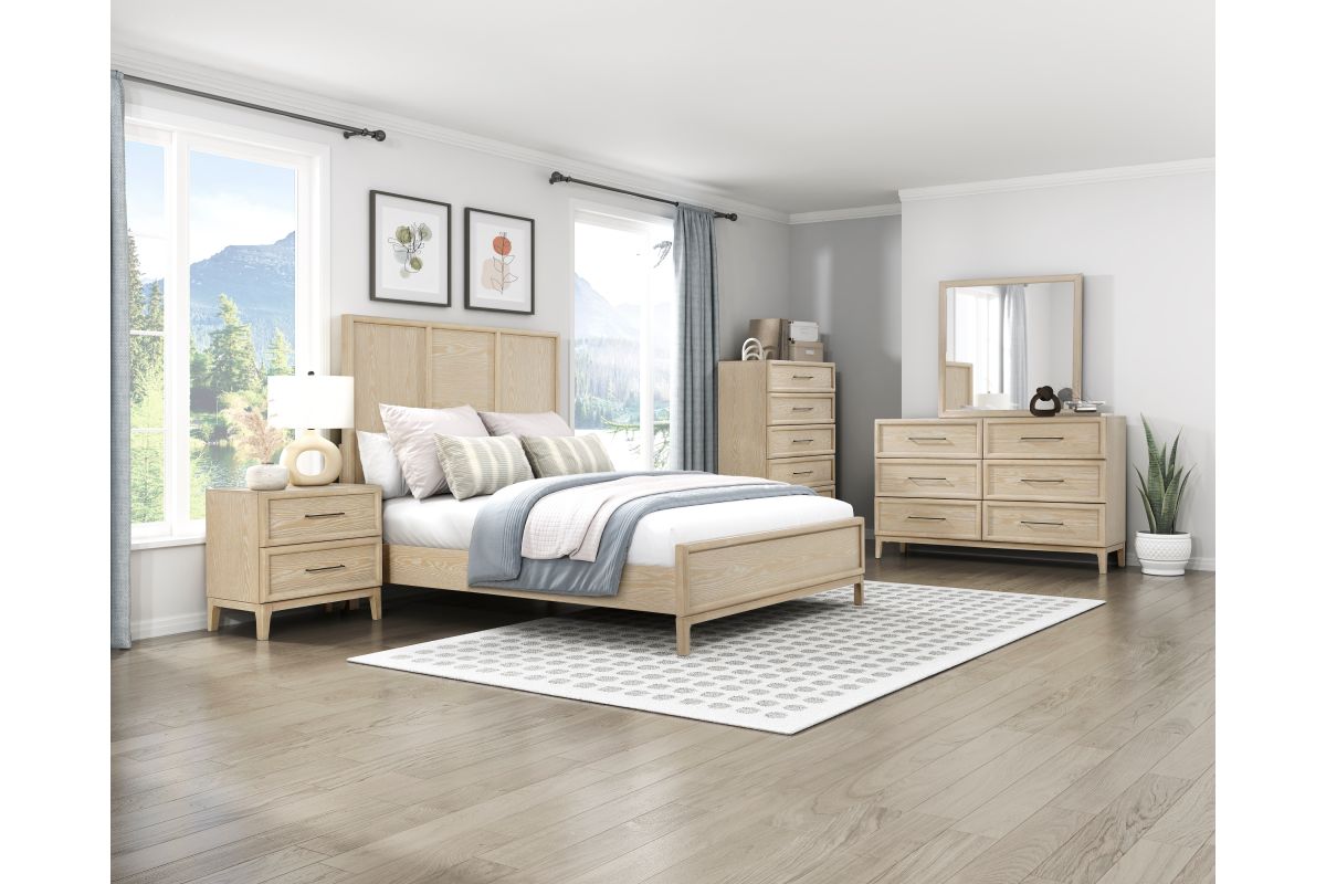 Introduce a serene, organic aesthetic to your sleeping space with this beautiful Eastern King panel bed. Crafted from a durable blend of wood and engineered wood and finished with a genuine oak veneer, this bed frame showcases the natural beauty of wood grain in a soothing light brown tone, perfect for a coastal, farmhouse, or transitional look. The headboard features a distinctive three-panel design, adding visual height and interest to the piece. This complete bed set includes the stylish headboard, matching footboard, and sturdy side rails, providing a solid foundation ready for your required box spring or foundation and mattress. This bed is the perfect centerpiece for a calm and sophisticated bedroom retreat.