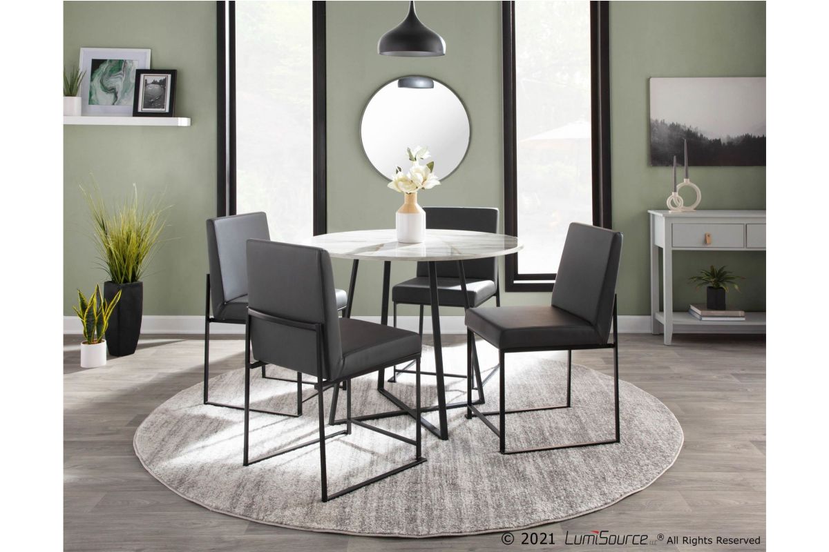 Modern elegance at its finest, the Fuji High Back Dining Chair features an extra-wide (and extra comfortable) upholstered seat, high padded backrest, and stylish metal frame. The perfect dining chair, the Fuji is multi-functional and can be used as extra seating in a sitting room or as a stylish office chair. Available in stainless steel or gold metal frame and a variety of sleek upholstery colors. Pair with the Fuji Dinette Table for a complete look.