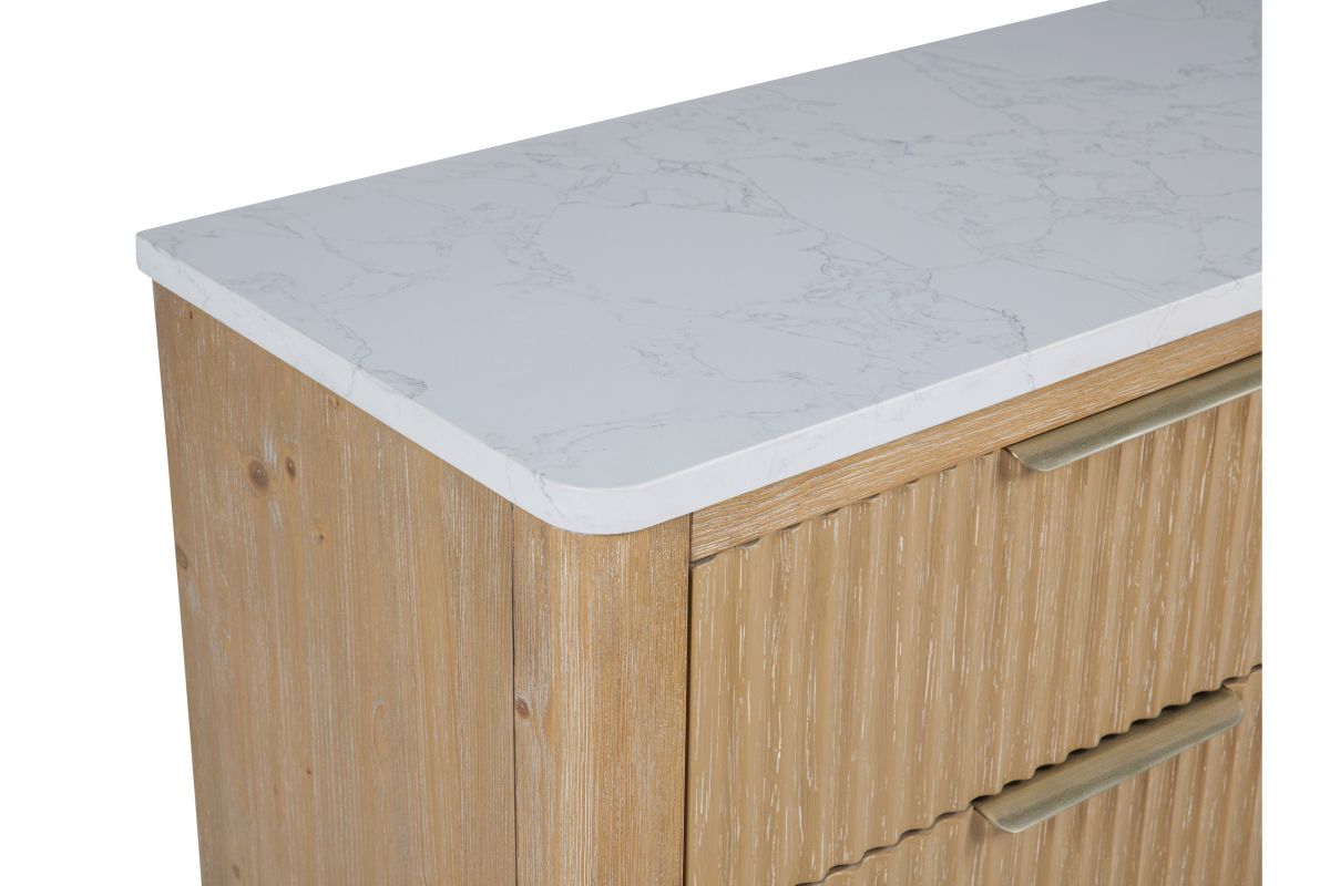 The Kara Cerused Natural Chest is a chest of drawers constructed from wood and metal that provides organized storage with a modern aesthetic. It features distinct textured drawer fronts. This chest offers a blend of practical storage and visual appeal for various interiors.