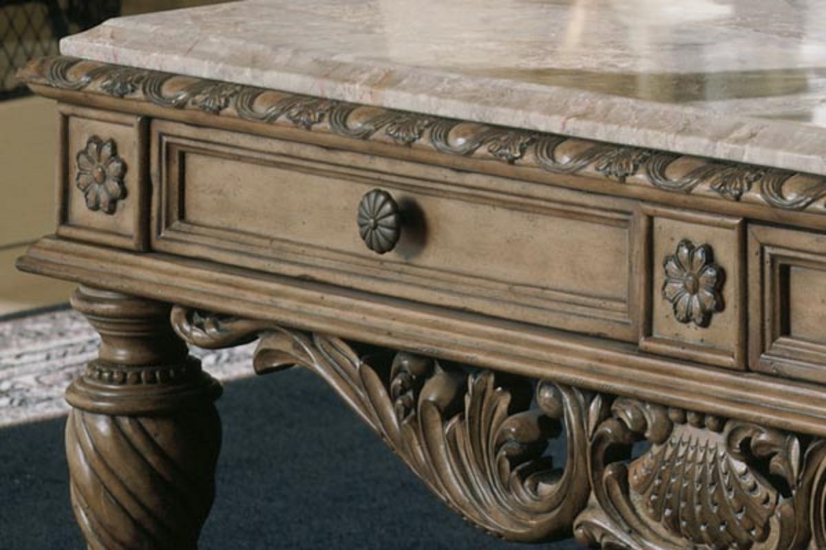 Diamond patterned marble parquetry tops. Ornate hand applied decoration throughout. Multi-stepped distressed finish. Dark bronze metal color hardware. Framed drawer fronts.